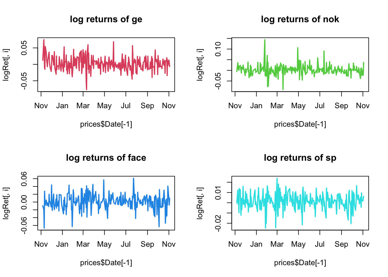 logRet<- apply(logprices,2,diff)We can give a look at the four time-series logreturns