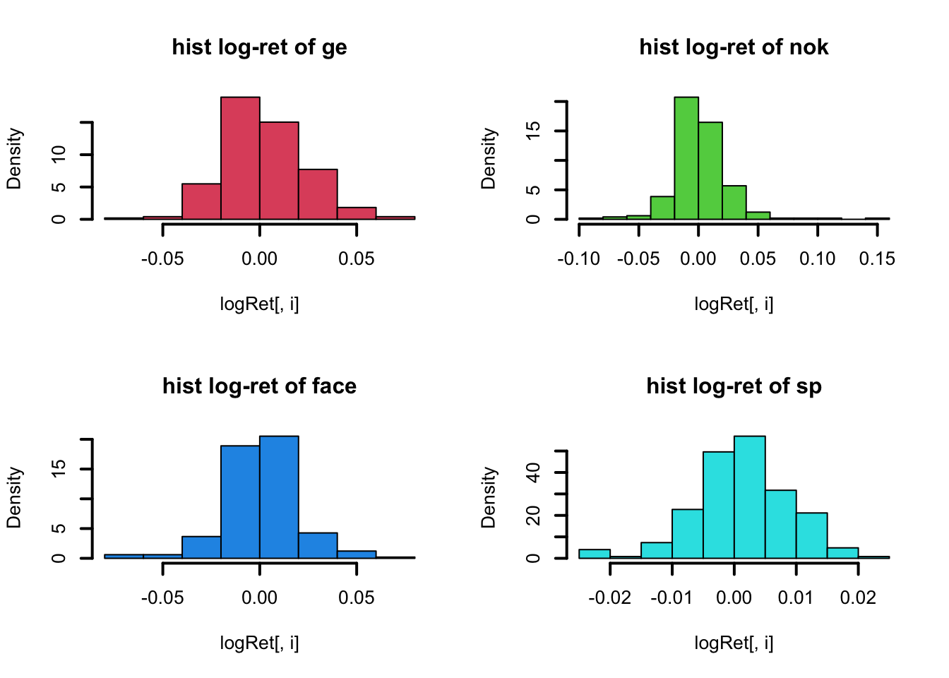 main=paste("hist log-ret of",names(prices)[i+1]),