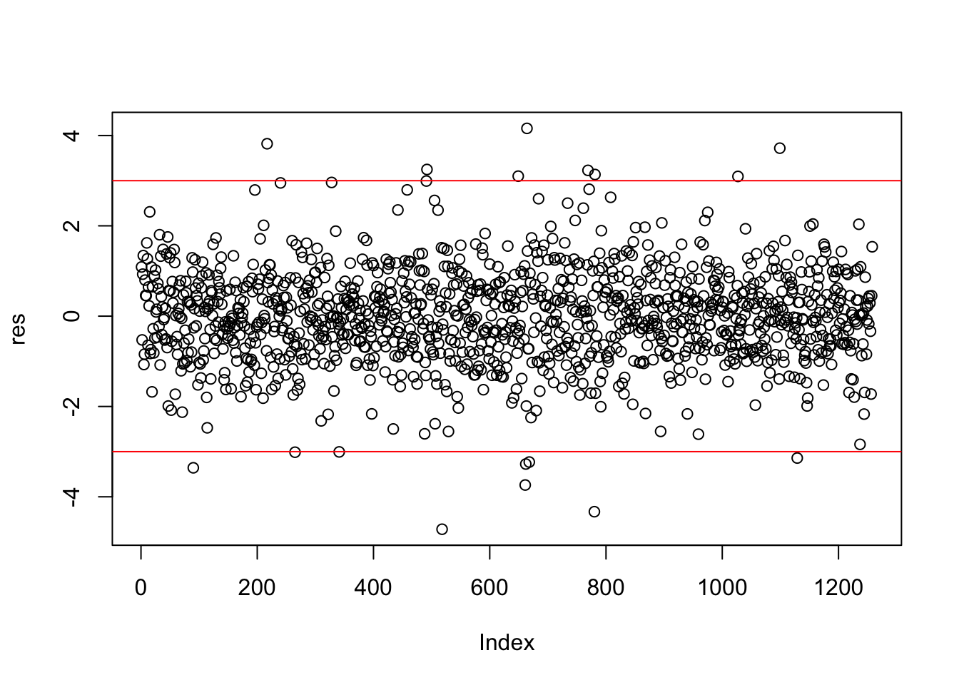 mean(res < -3 | res >+3)*100## [1] 1.351351