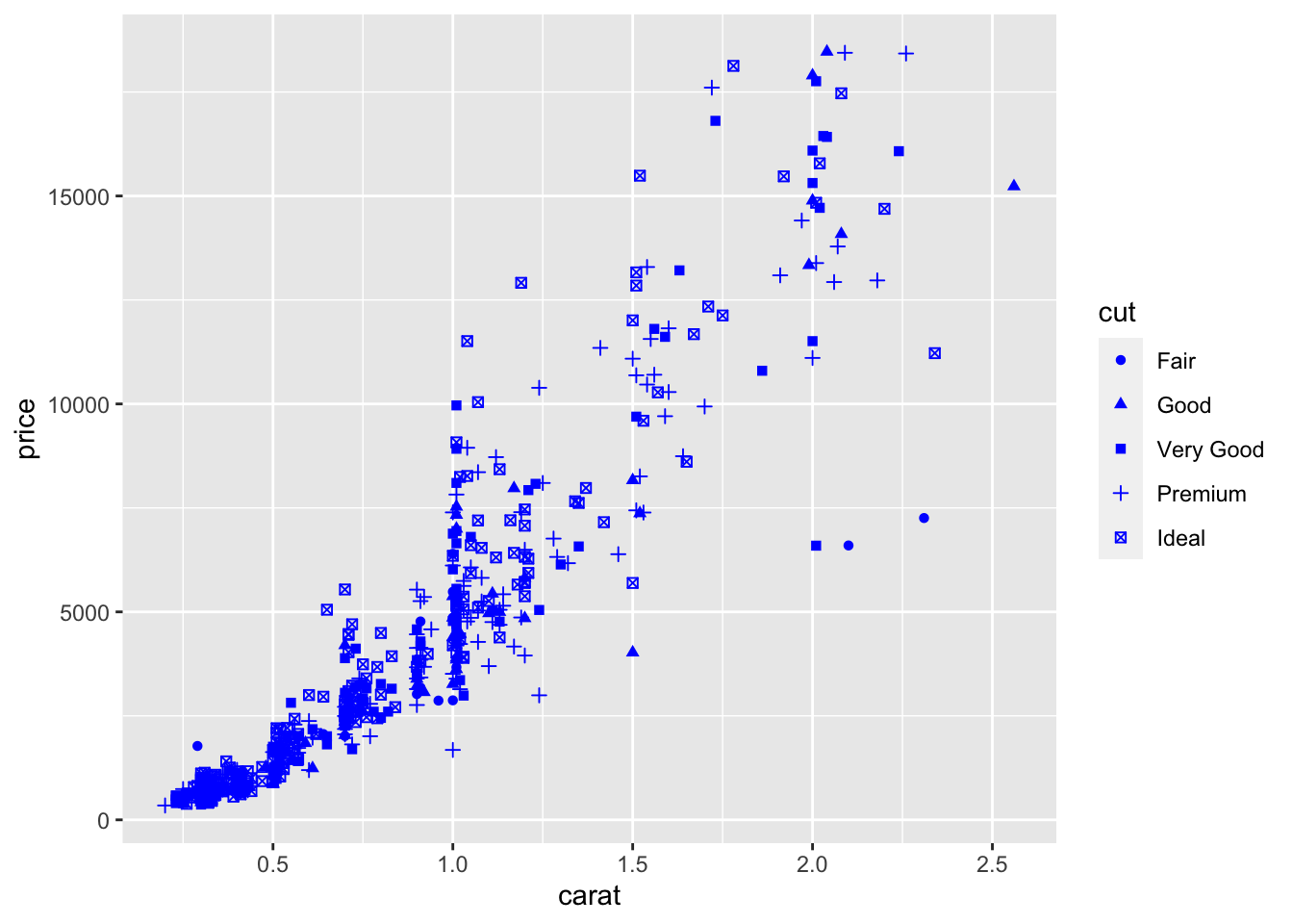 geom_point(mapping = aes(x=carat,y=price), color="blue") +