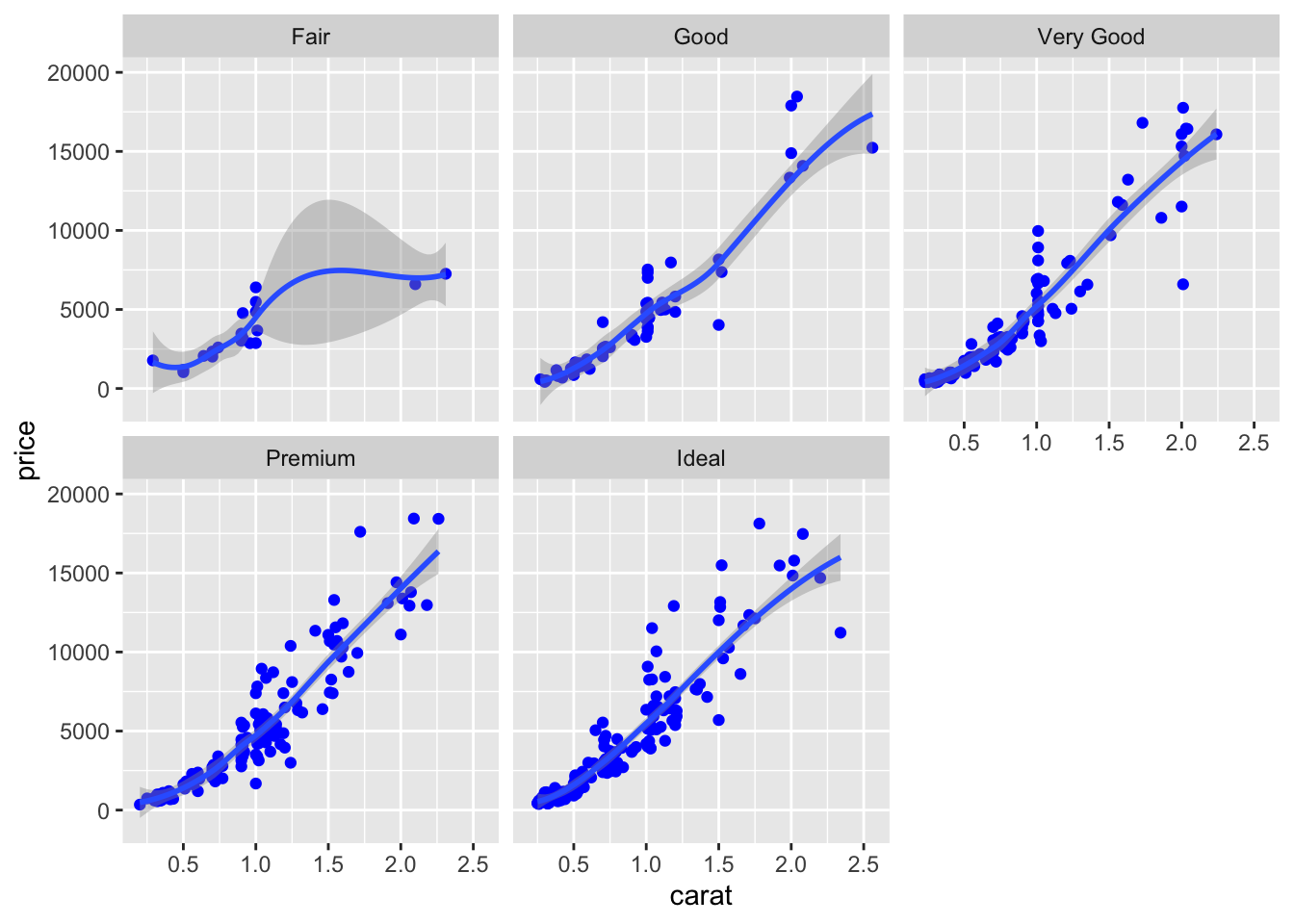 Finally, an alternative for considering the distribution of carat and price conditionally on cut is to produce 5 separate scatterplots according to the 5 categories of cut. In this case we use the facet which defines how data are split among panels. The default facet puts all the data in a single panel, while facet_wrap and