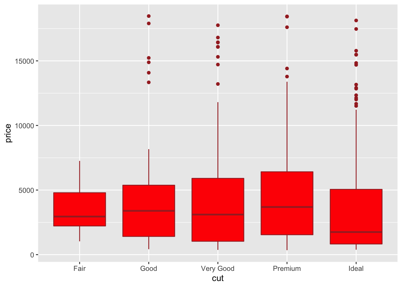 The boxplot can be used to study the distribution of a quantitative variable (e.g. price) conditioning on the categories of a factor (e.g. cut). It can be obtained by using the geom_boxplot geometry, where x is given by the qualitative variable: