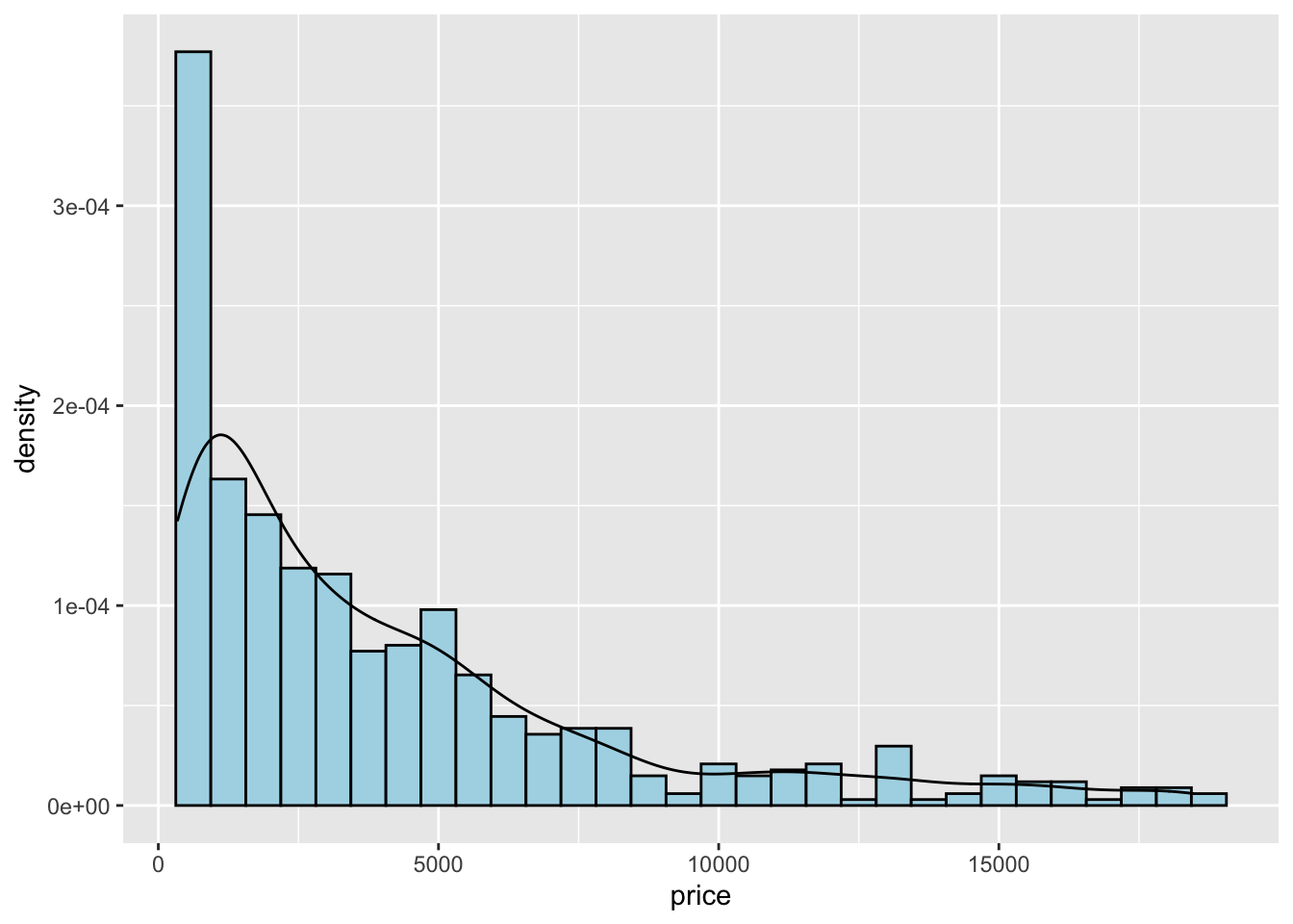 geom_density(aes(x=price))## `stat_bin()` using `bins = 30`. Pick better value with `binwidth`.