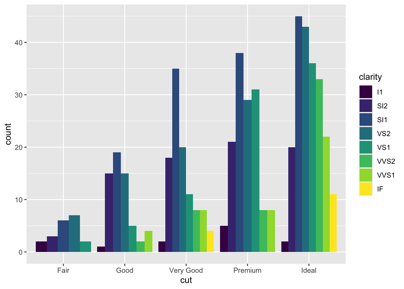 Note that the bars are automatically stacked and each colored rectangle represents a combination of cut and clarity. The stacking is performed automatically by the position adjustment given by the position argument (by default it is set to position = "stack"). Other possibilities are "dodge" and "fill":