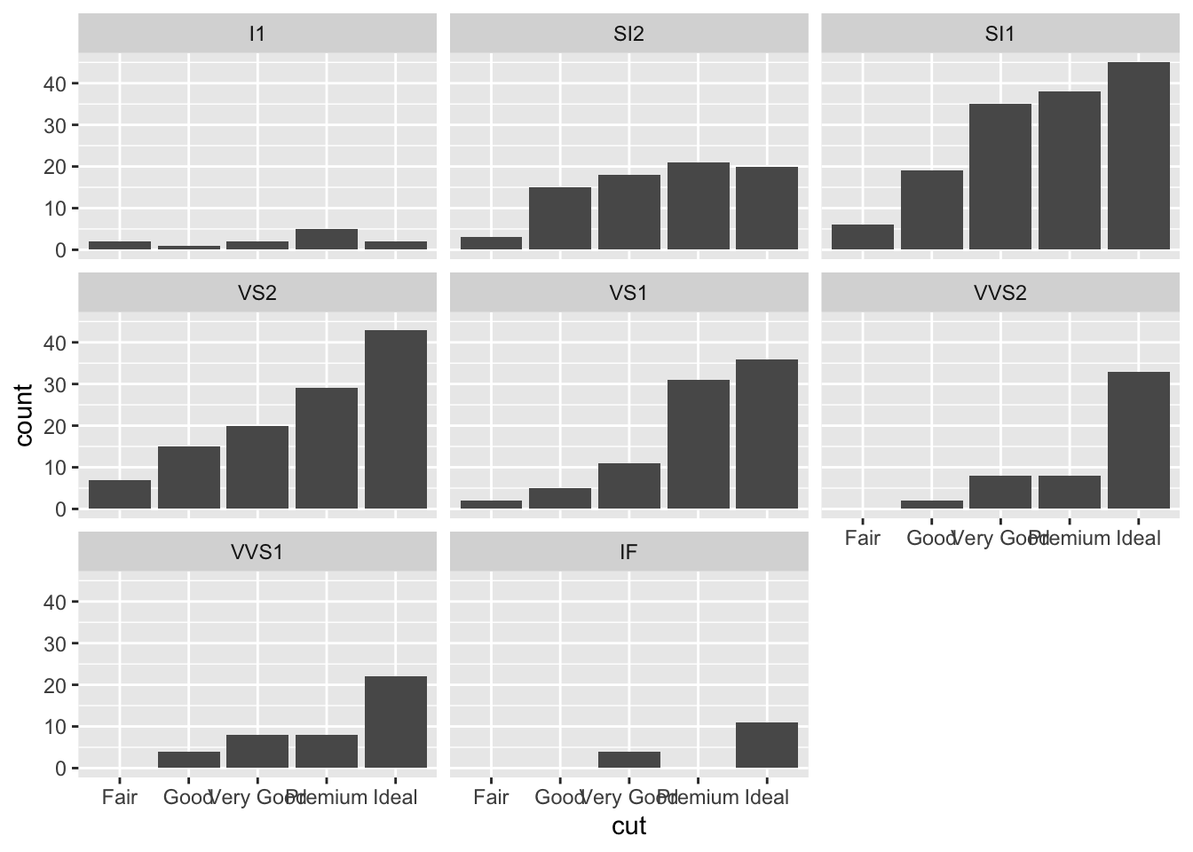 An alternative consists in the use of facet_wrap that will create 8 separate plots (as the number of categories of clarity) each representing the conditional cut distribution:
