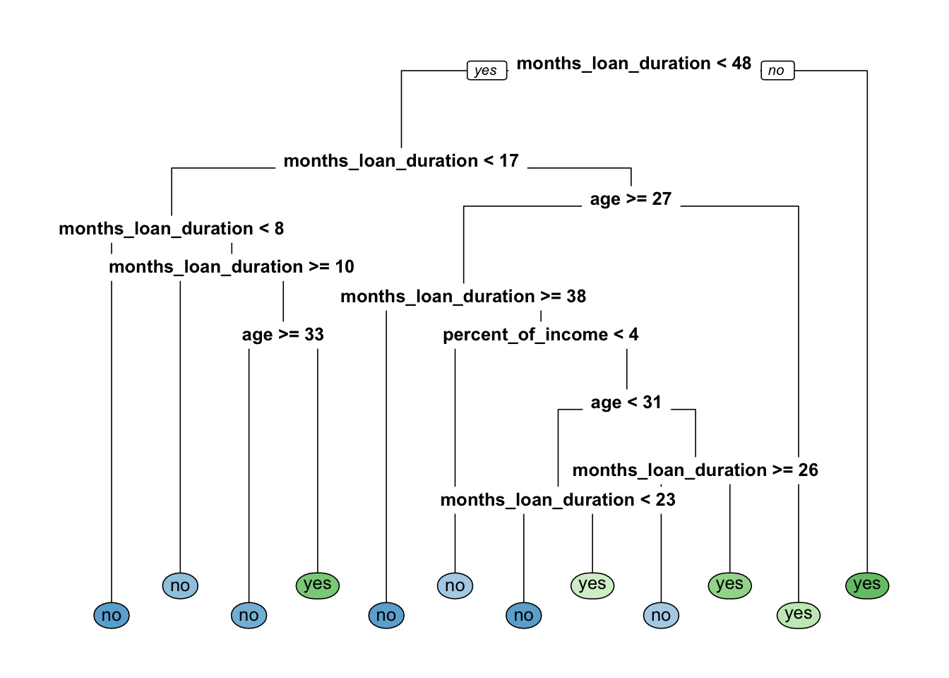 ## 8) months_loan_duration< 7.5 33 5 no (0.8484848 0.1515152) *