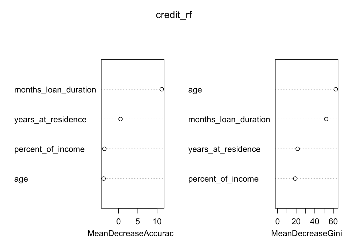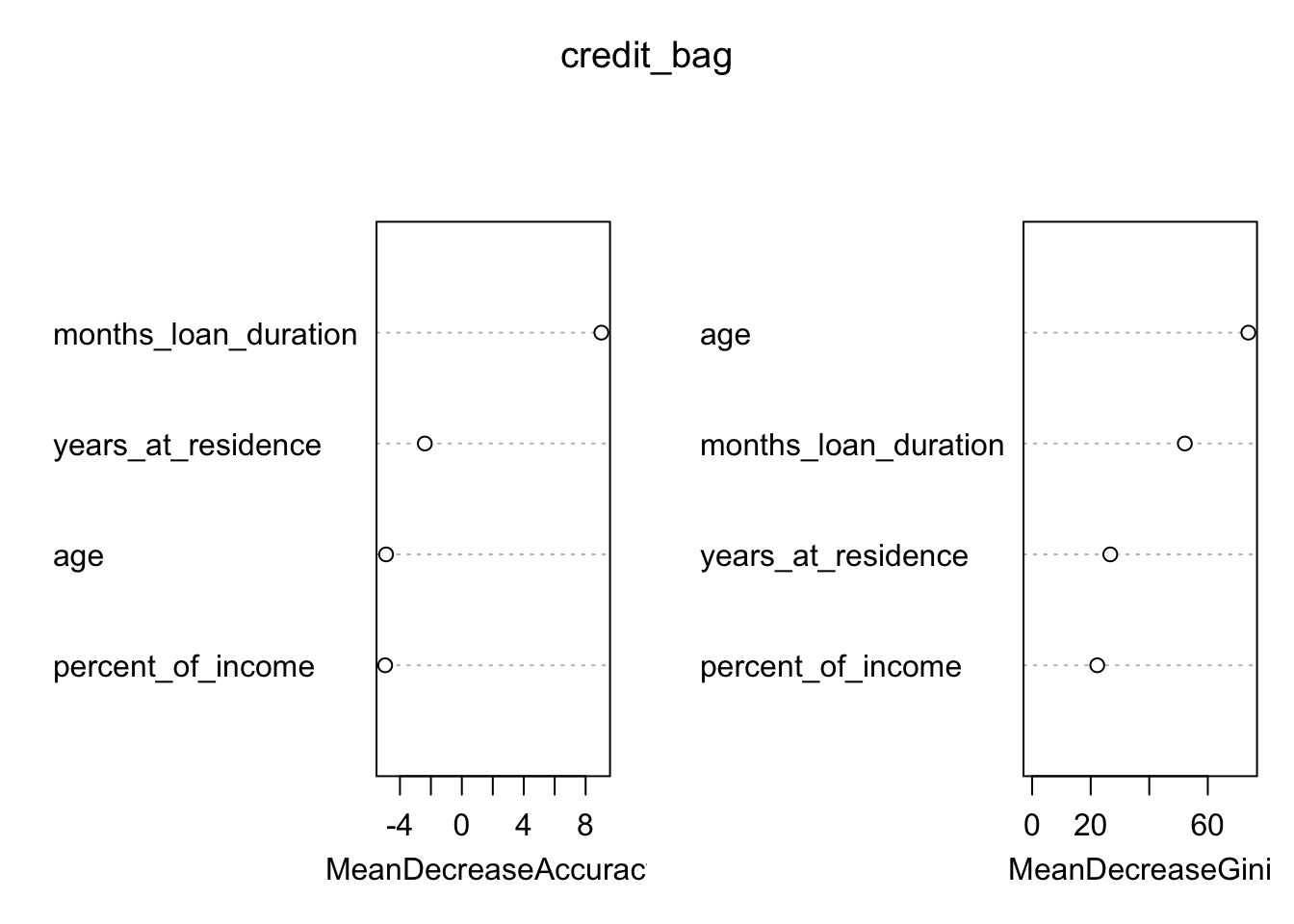 For the considered case we see that months_loan_duration and age are the two most important regressors (the former was used also in the single pruned tree).