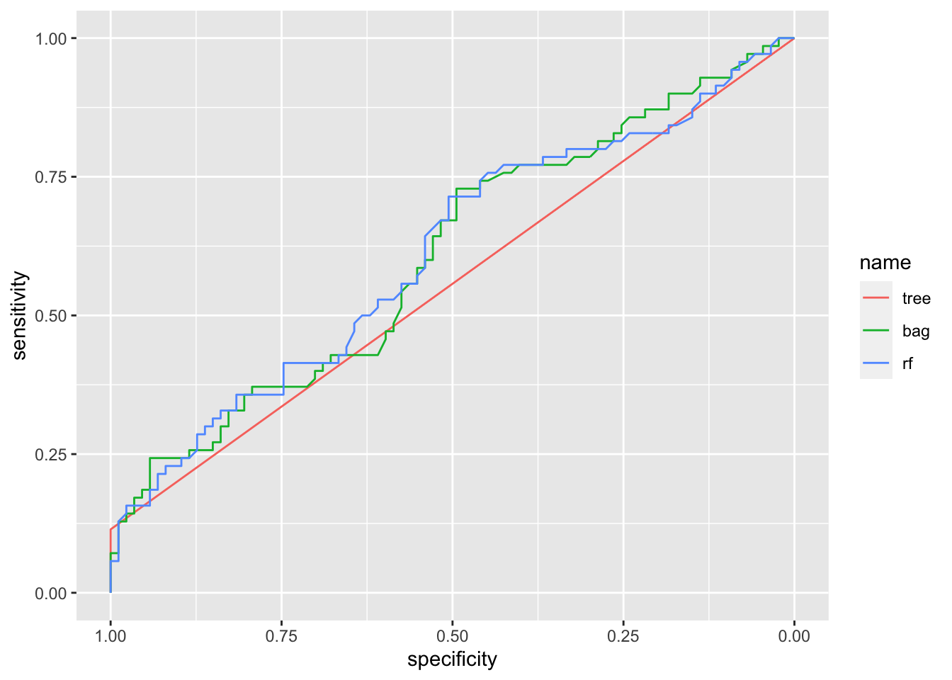 Note that the roc curve for the single tree is practically a straight line. This is basically due to the fact that the single tree is a stump and specificity/sensitivity (computed using predictions) don’t change that much by modification of the probability threshold. The bagging and random forest roc curves are very similar.