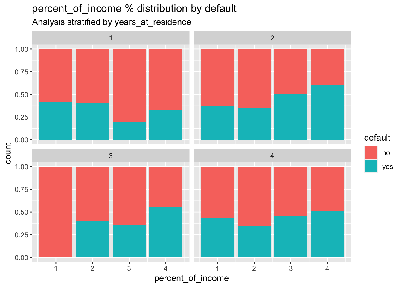 # some small differences in the distribution of the default are visible across the different categories of percent_of_income and years_at_residceWe split the dataset in training (70%) and test set (30%) by using the approach described in Section 2.1.1: