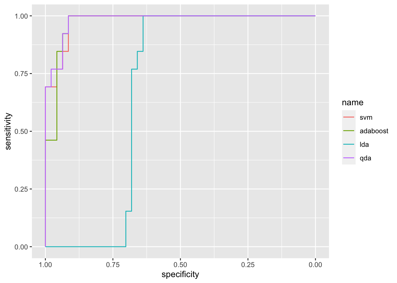 We compare, by means of accuracy, the Adaboost algorithm with linear and quadratic discriminant analysis (LDA and QDA).