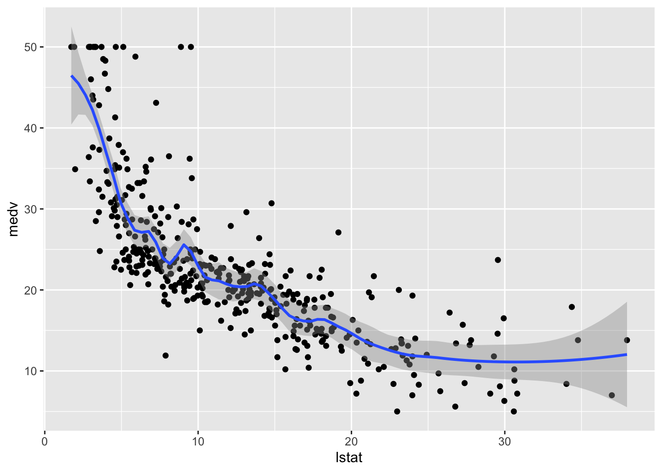 We consider lstat (lower status of the population (percent)) as regressor/covariate and medv (median value of owner-occupied homes in $1000s) as response variable. The relationship between the two variables is shown in the following plot:
