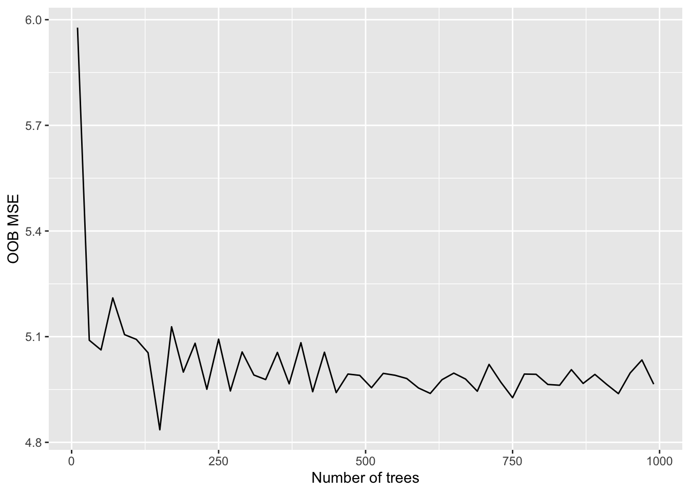 We can observe that starting from \(B=500\) the OOB MSE is stable (so it’s fine to run bagging with \(B=500\)).