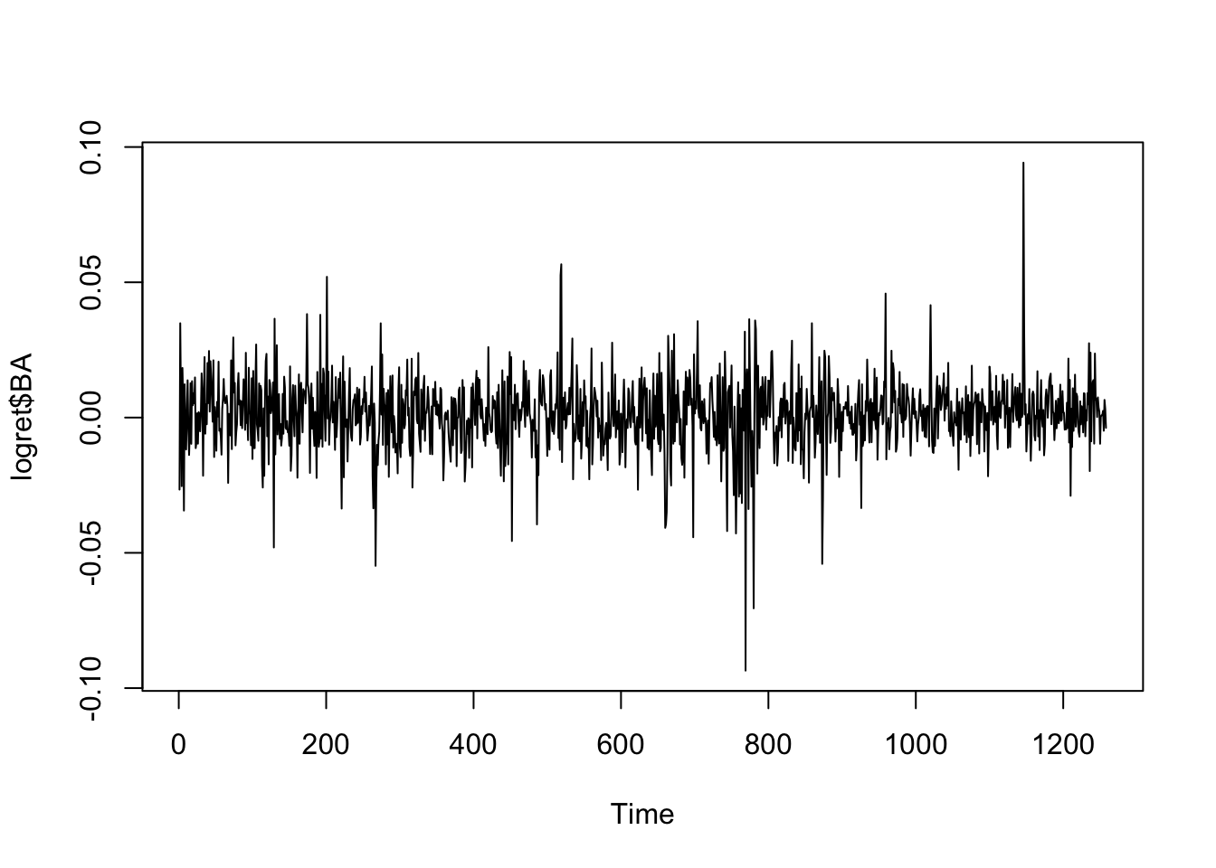 Consideriamo i rendimenti logaritmici di BA la cui serie storica appare stazionaria rispetto alla media (non sono infatti presente trend crescenti o decrescenti). Si osservano episodi di valori estremi: