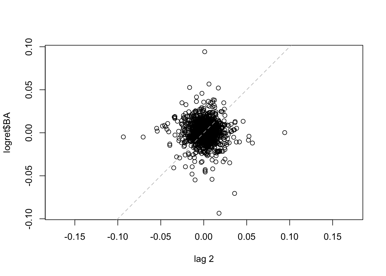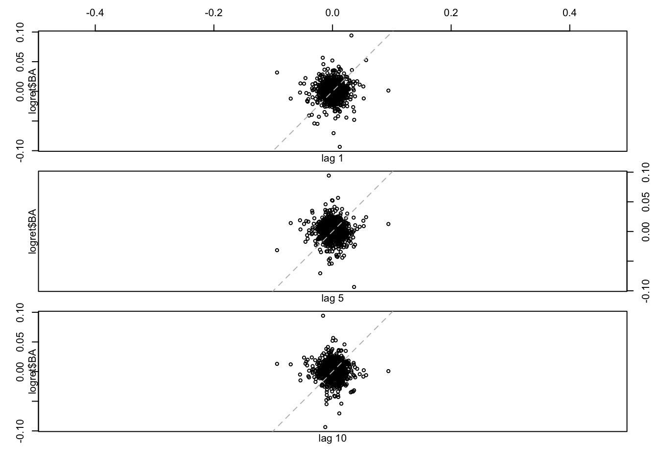 La linea tratteggiata nel grafico rappresenta l’intercetta. Si osserva che i punti sono dispersi nei quattro quadranti del grafico, sintomo di una correlazione debole. Lo stesso grafico può essere ottenuto, per esempio, per il caso di \(h=2\) (per rappresentare \(y_t\) vs \(y_{t-2}\) per \(t=3, \ldots,\) 1258) ), 500 and 1000.
