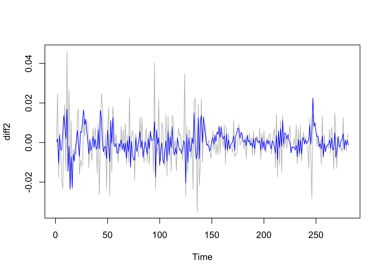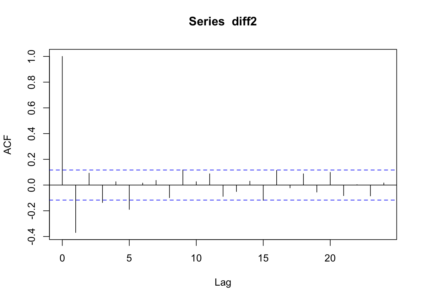 adf.test(diff2, alternative = "stationary")## Warning in adf.test(diff2, alternative = "stationary"): p-value smaller than