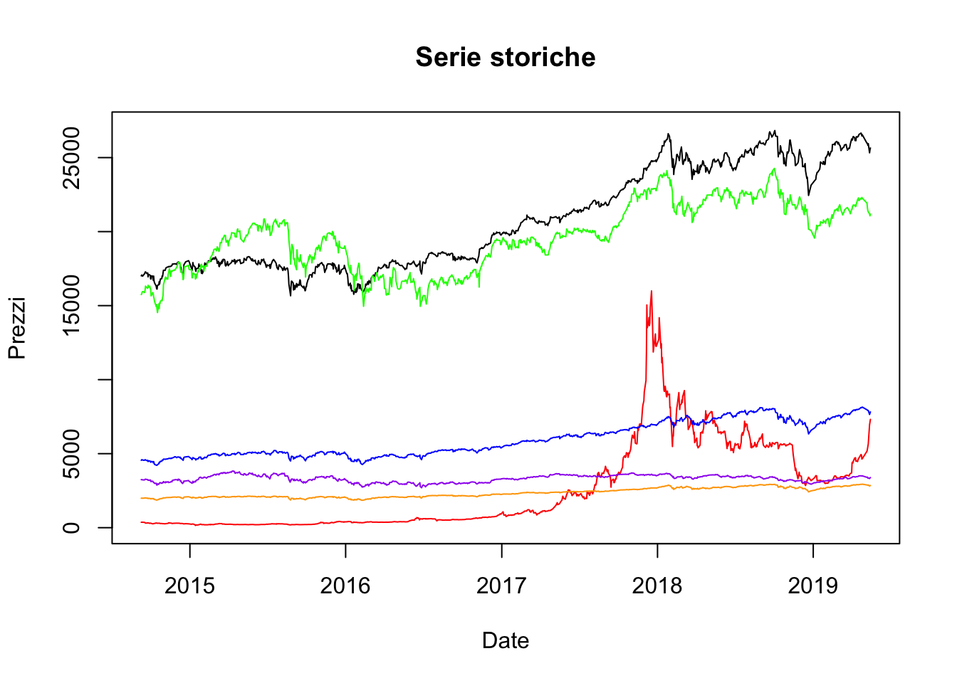 Utilizzando lo stesso approccio è quindi possibile rappresentare graficamente tutte le serie storiche dei prezzi: