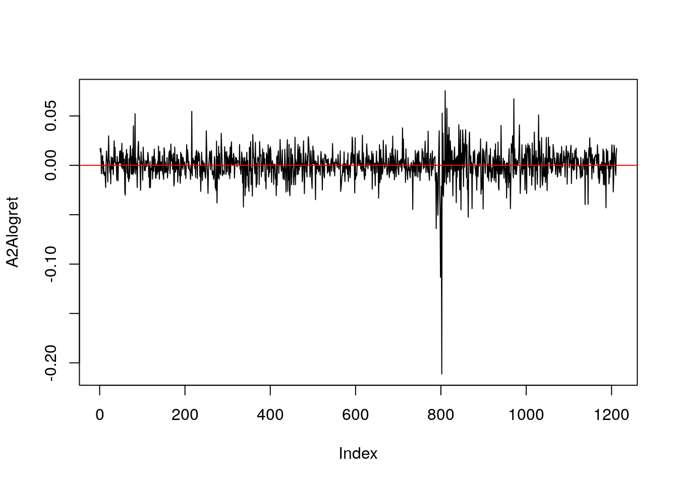 Si noti che l’oggetto A2Alogre è un vettore. E’ possibile rappresentare graficamente la serie di log-rendimenti come segue, includendo anche nel grafico una linea orizzontale in corrispondenza di 0 che è il valore di riferimento: