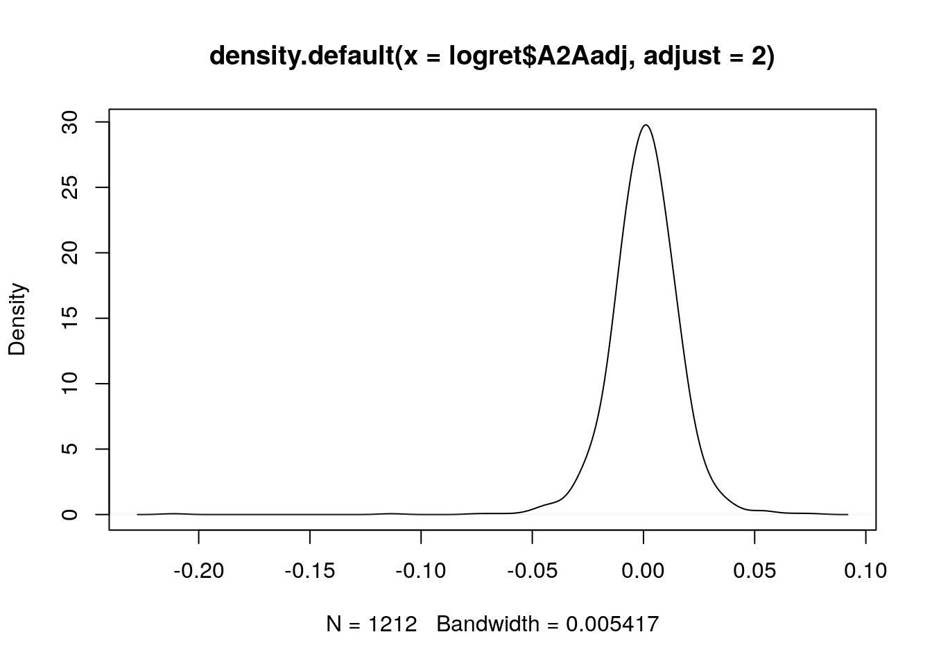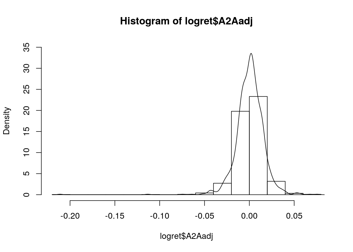 mean((logret$A2Aadj - mean(logret$A2Aadj ))^3) / sd(logret$A2Aadj )^3## [1] -2.206542