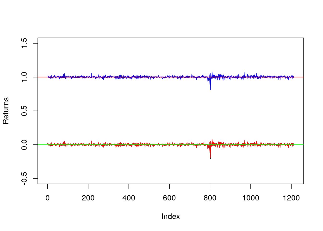 La funzione abline aggiunge una linea costante orizzontale al grafico per \(y=1\) e \(y=0\) che rappresentano il valore di riferimento per i rendimenti lordi e netti/logaritmici (indicano nessun cambiamento nel prezzo).