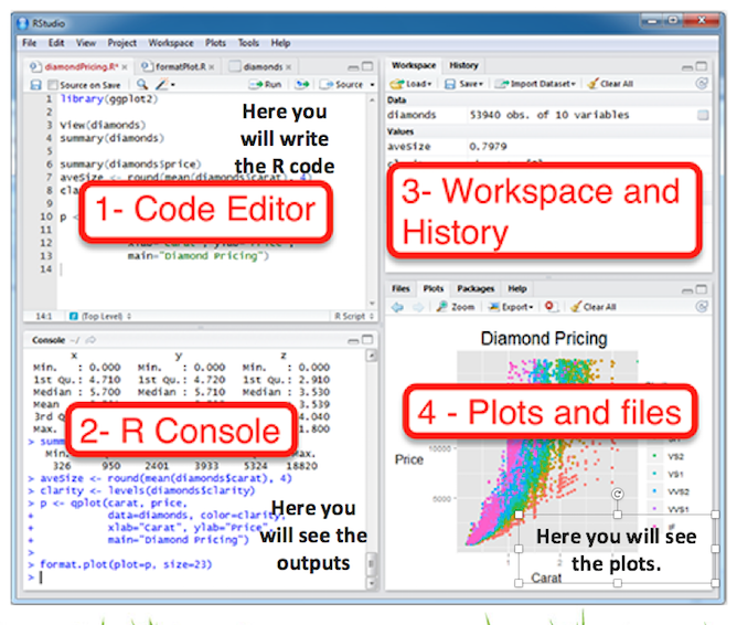 Nel pannello in alto a sinistra (code editor panel) hai a disposizione gli script, ovvero file di testo specifici per scrivere codice di R. Nel pannello in basso a sinistra (console panel) puoi vedere i risultati delle tue analisi e far girare del codice istantaneamemnte (senza usare uno script). Il pannello in basso a destra (File/Plots/Packages/Helps panel) mostra i grafici e i file di help. Infine, il pannello in alto a destra (Environment panel) è usato principalmente per mostrare gli oggetti salvati nello spazio di lavoro, per leggere la storiografia dei comandi e importare file.