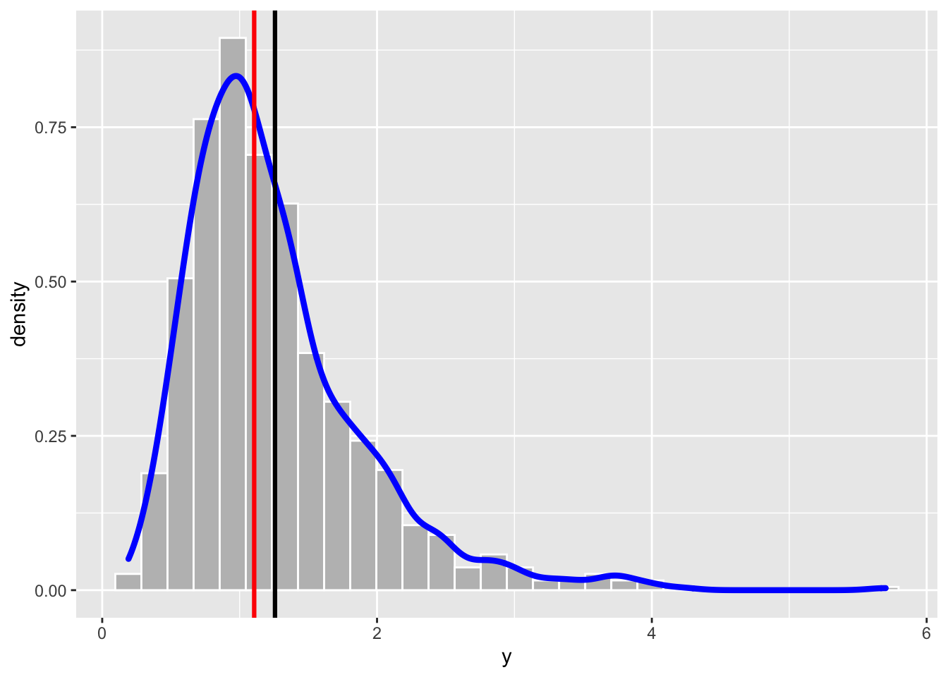 geom_vline(xintercept = median(y), col="red", lwd=1.1)## `stat_bin()` using `bins = 30`. Pick better value with `binwidth`.