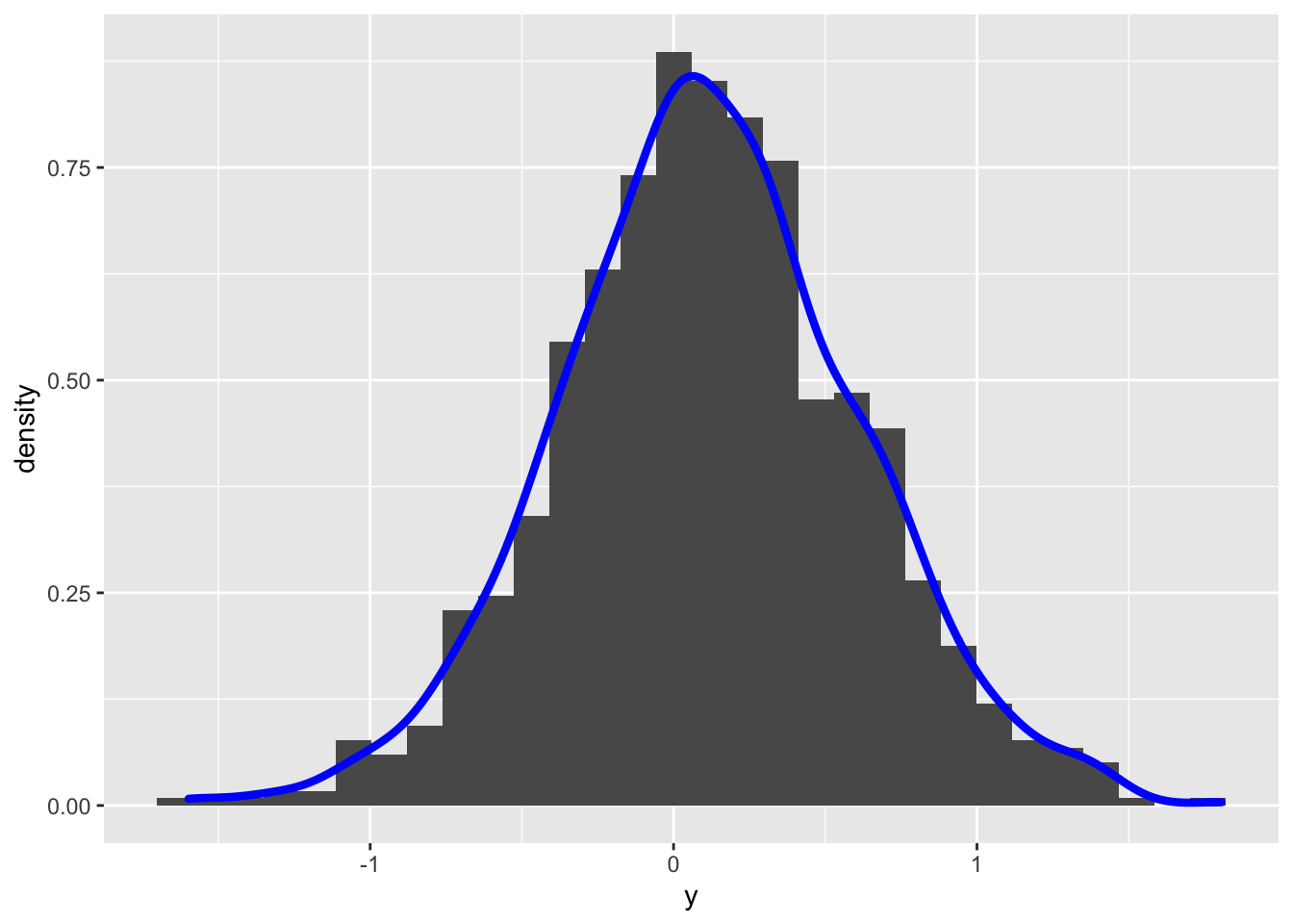 geom_density(aes(y), col="blue", lwd=1.5) ## `stat_bin()` using `bins = 30`. Pick better value with `binwidth`.