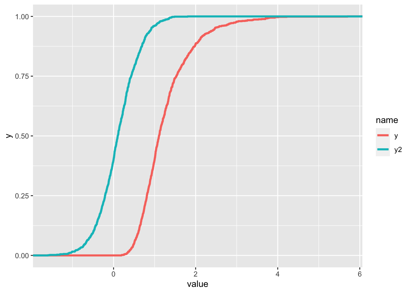 The 2 ECDFs reflect the differences in the two distributions. The limitation of this plot is that it doesn’t have a legend for the two colors. We thus need to transform the data from wide to long format, as the long data format is better with ggplot: