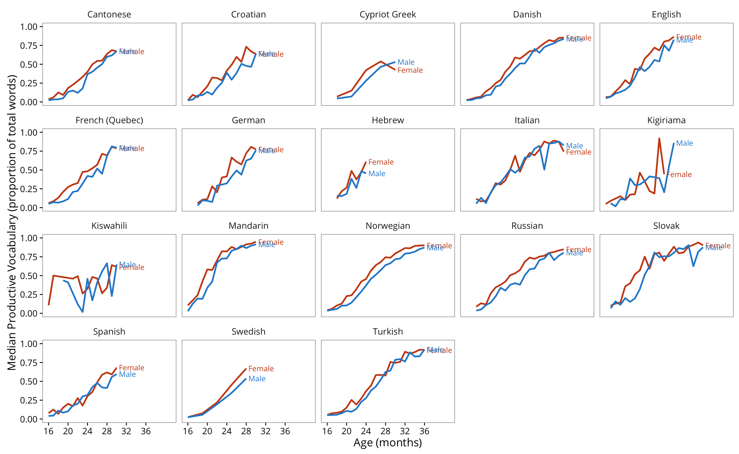 summarise(n = n())Normalize productive vocabulary size as a proportion of items and calculate median vocabulary size for each language, sex/gender, and age.