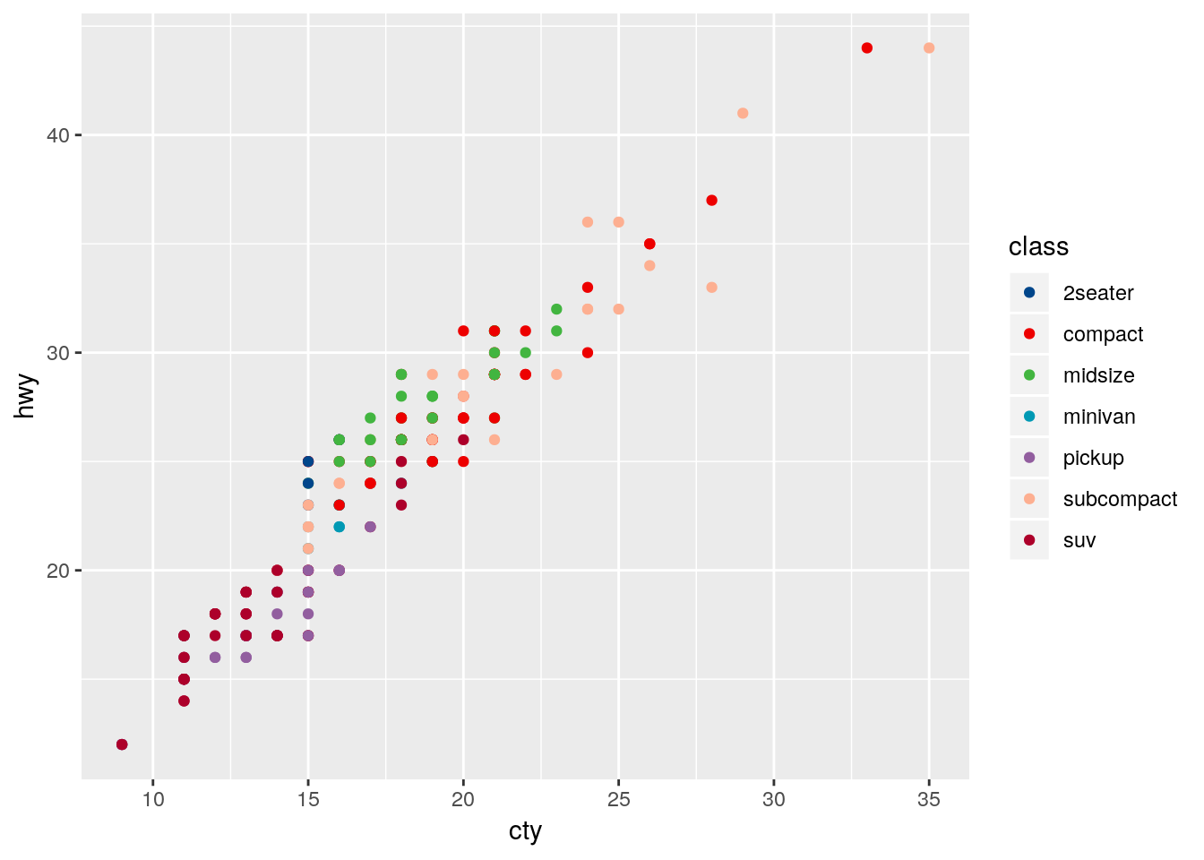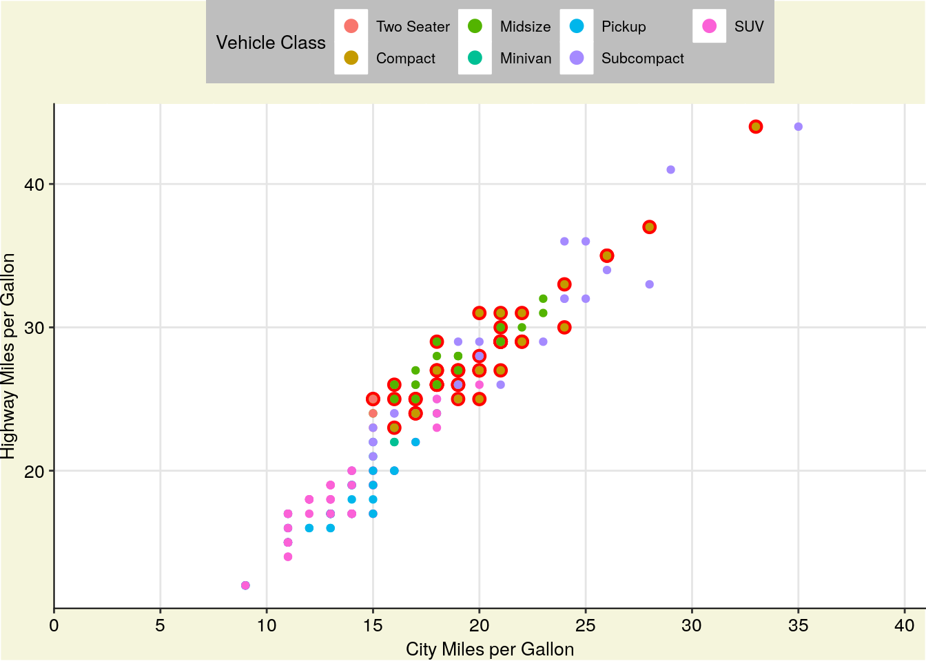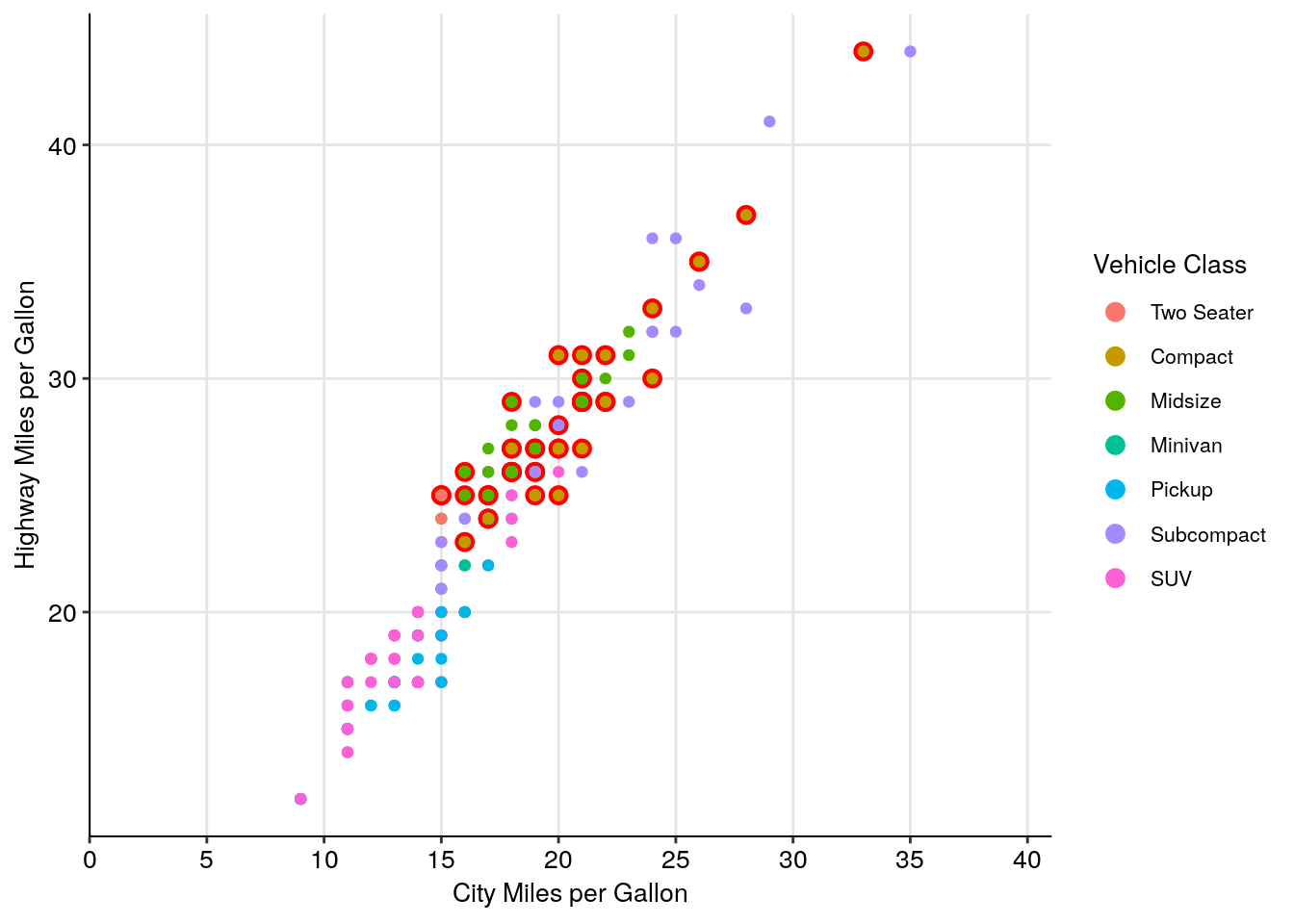 geom_point(data = filter(mpg, class == "compact"), size = 3, color = "red") +