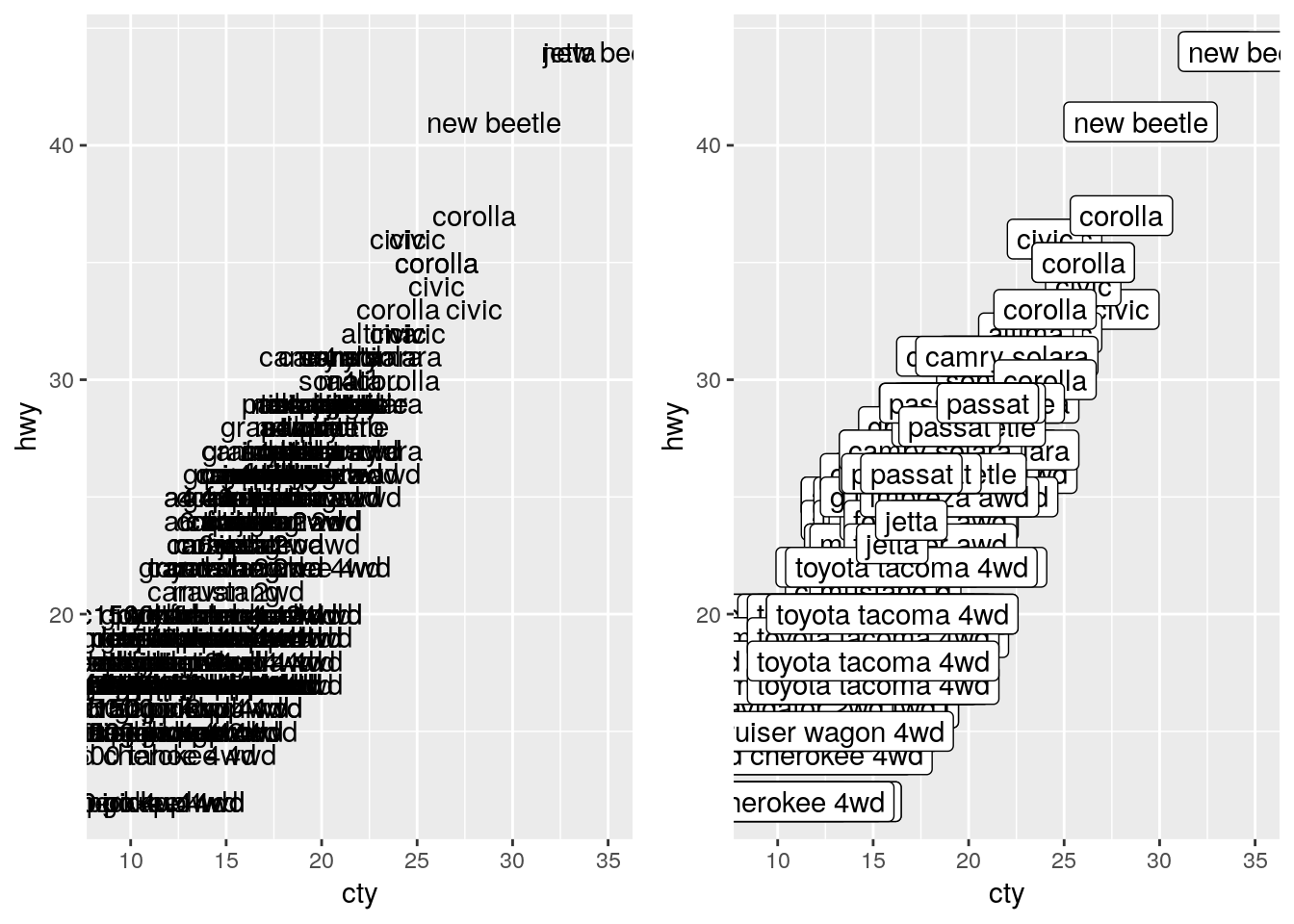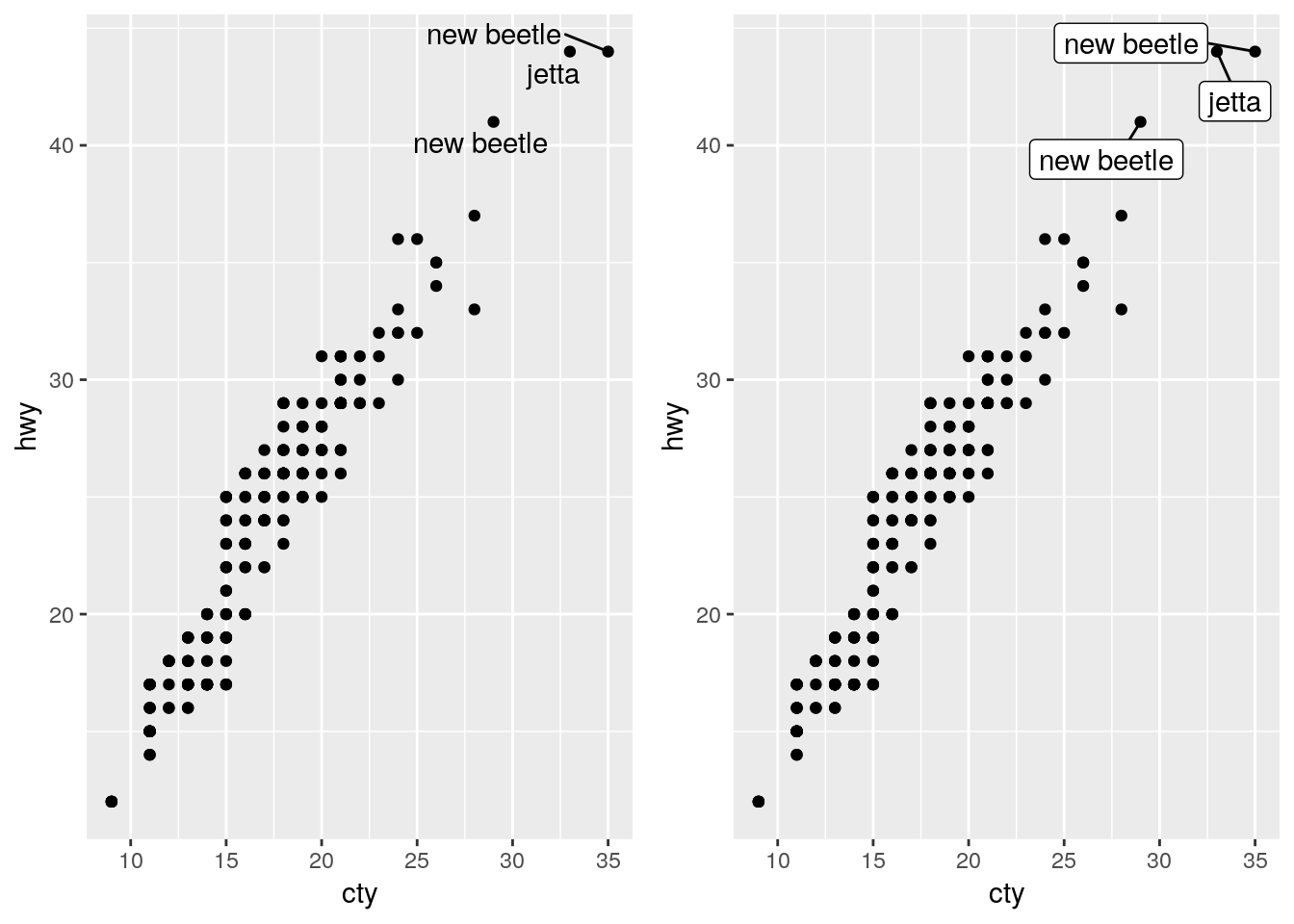 ggrepel::geom_text_repel(data = filter(mpg, hwy > 40), aes(label = model))