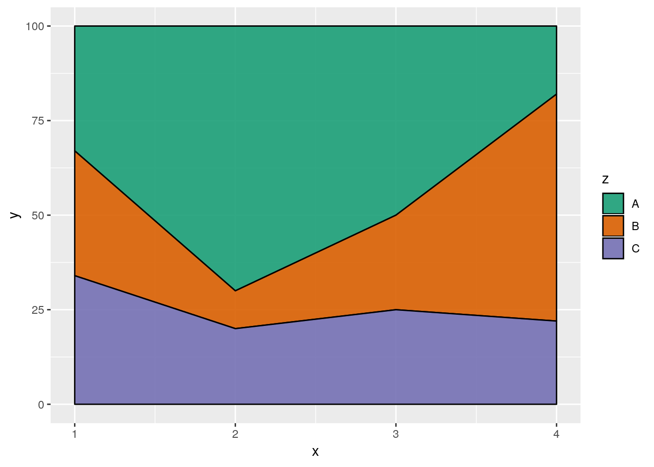 If you want to show how the distribution of several groups change over time, one method is to use what’s known as a stacked area chart. While very visually appealing, this chart design has a lot of the drawbacks of stacked bar plots - it can be hard to see how exactly values change (for instance, compare A and C in the plot below). However, if you’re working with timeseries data, the changes in your values are relatively obvious, or you care more about aesthetics than usefulness, this plot can be a good choice. Just specify a fill aesthetic for a geom_area() plot: