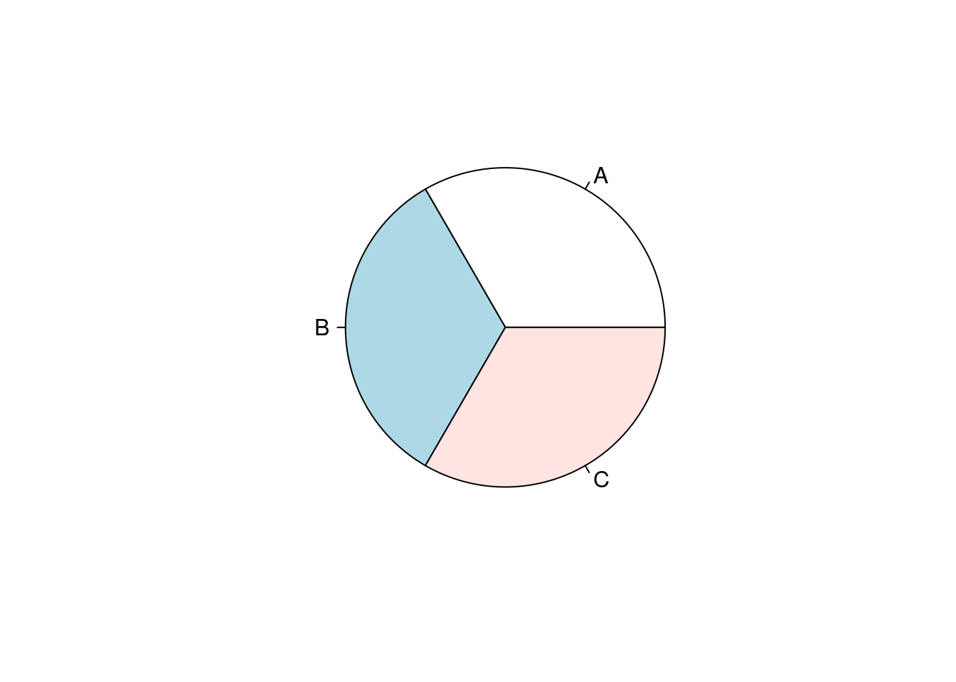 Pie charts are much maligned, but do have some benefits over bar plots - for instance, if you’re trying to represent proportional data, pie charts perform better than stacked or dodged column charts. While ggplot doesn’t include a native method for making pie charts, you could use base R’s pie() function: