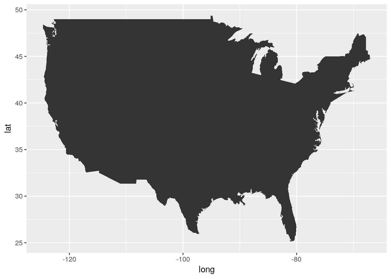 ggplot includes a function specifically designed to extract data from these packages, map_data(). We’re going to extract the usa map from the maps package and store it in usa.