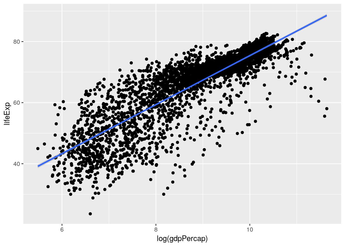 ## lm(formula = lifeExp ~ log(gdpPercap), data = gapminder_unfiltered)