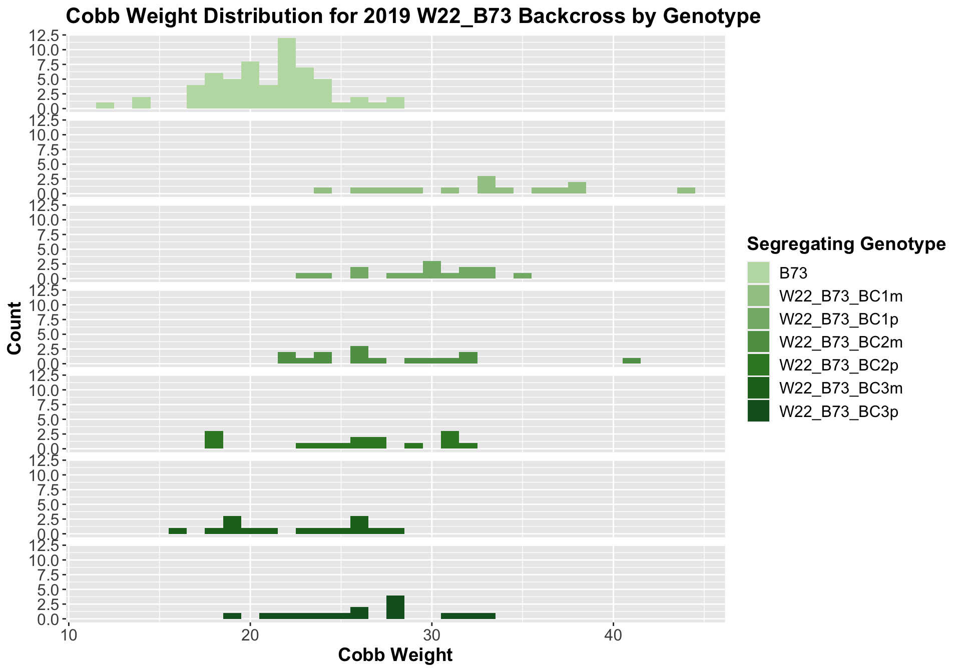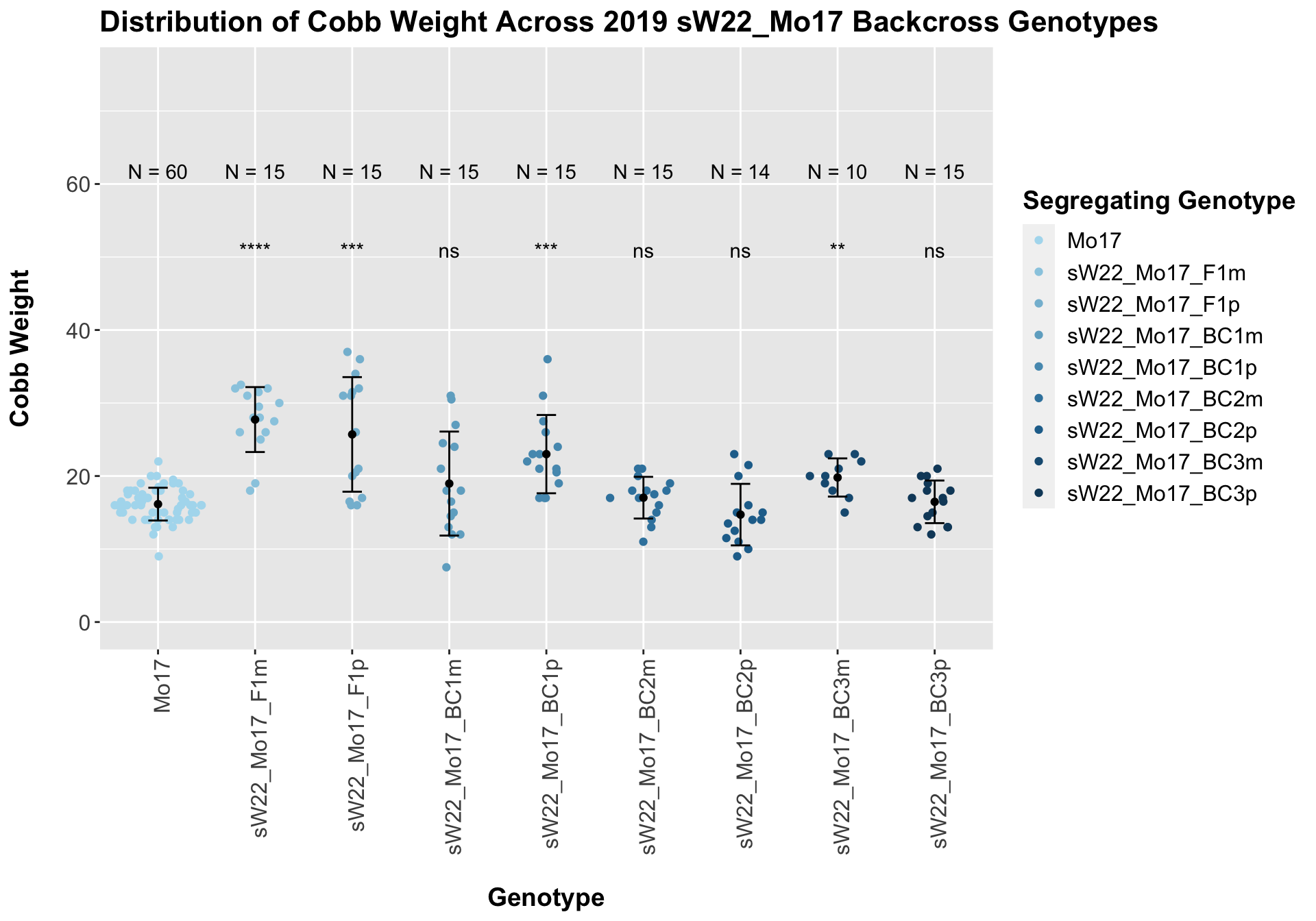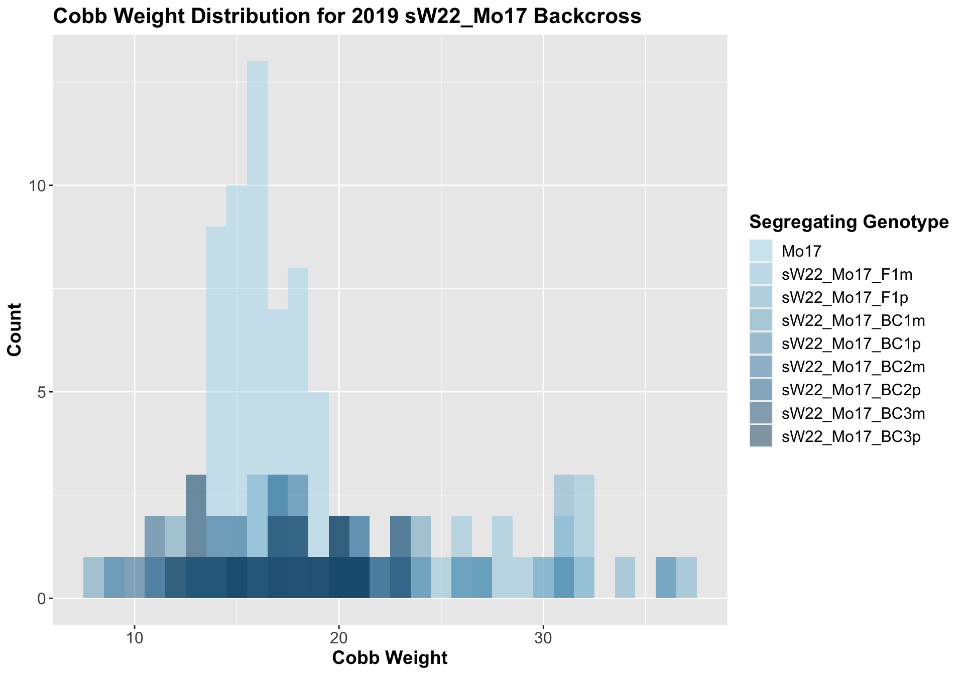 We see a significant increase in cobb weight at the sW22_Mo17 F1s that declines across subsequent backcrosses. By the later generations, it is not that different from the Mo17 cobb weight. This is similar to what we saw for the sW22_B73 backcross.