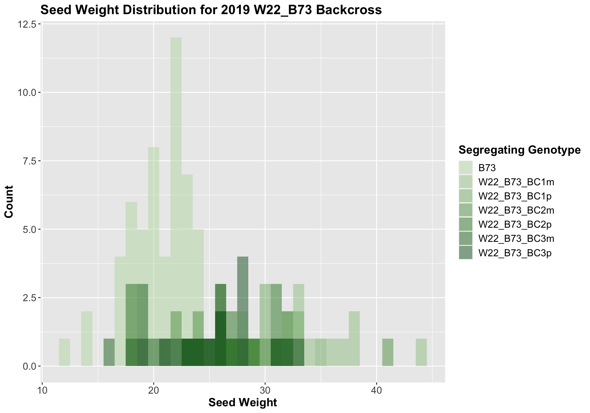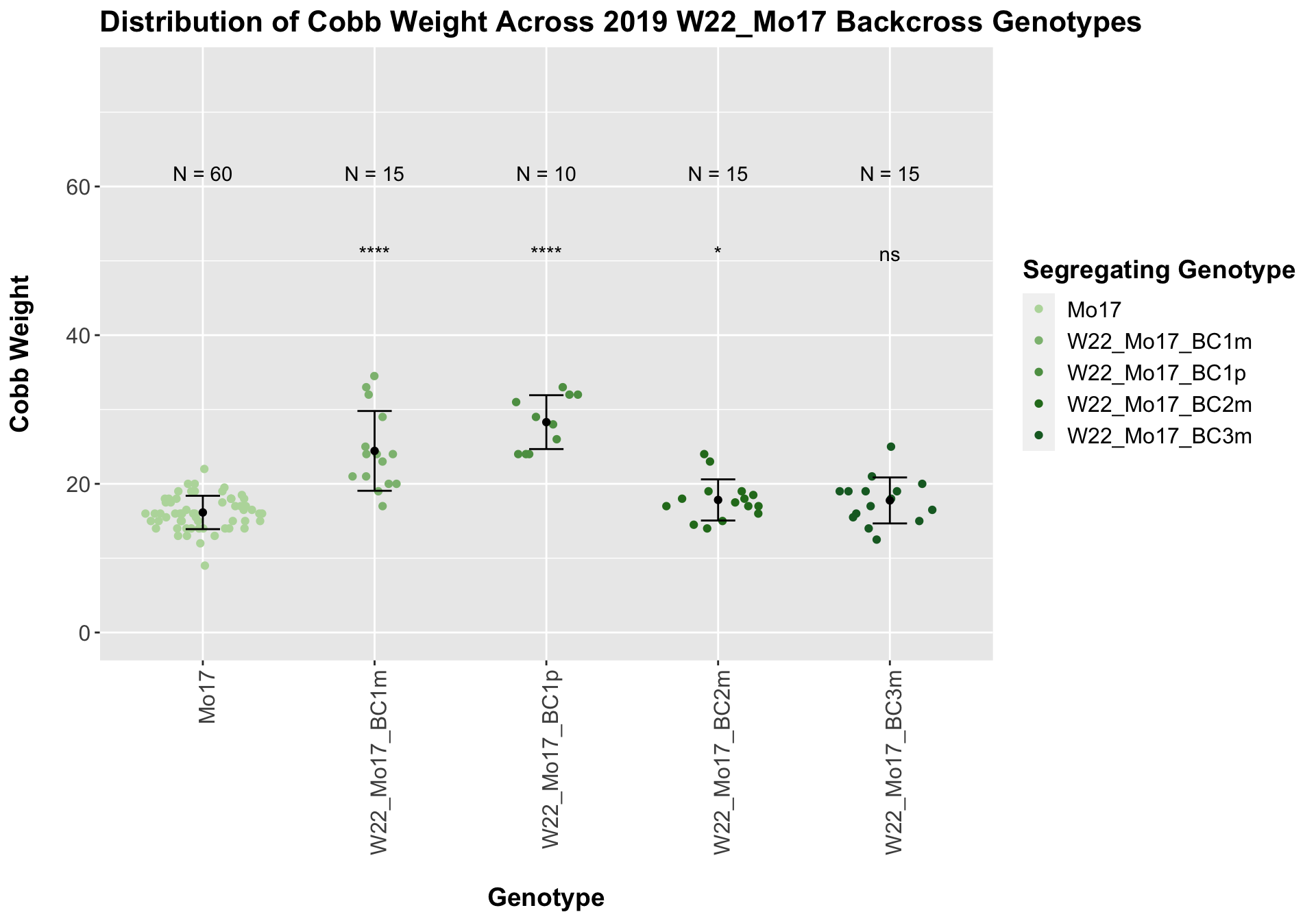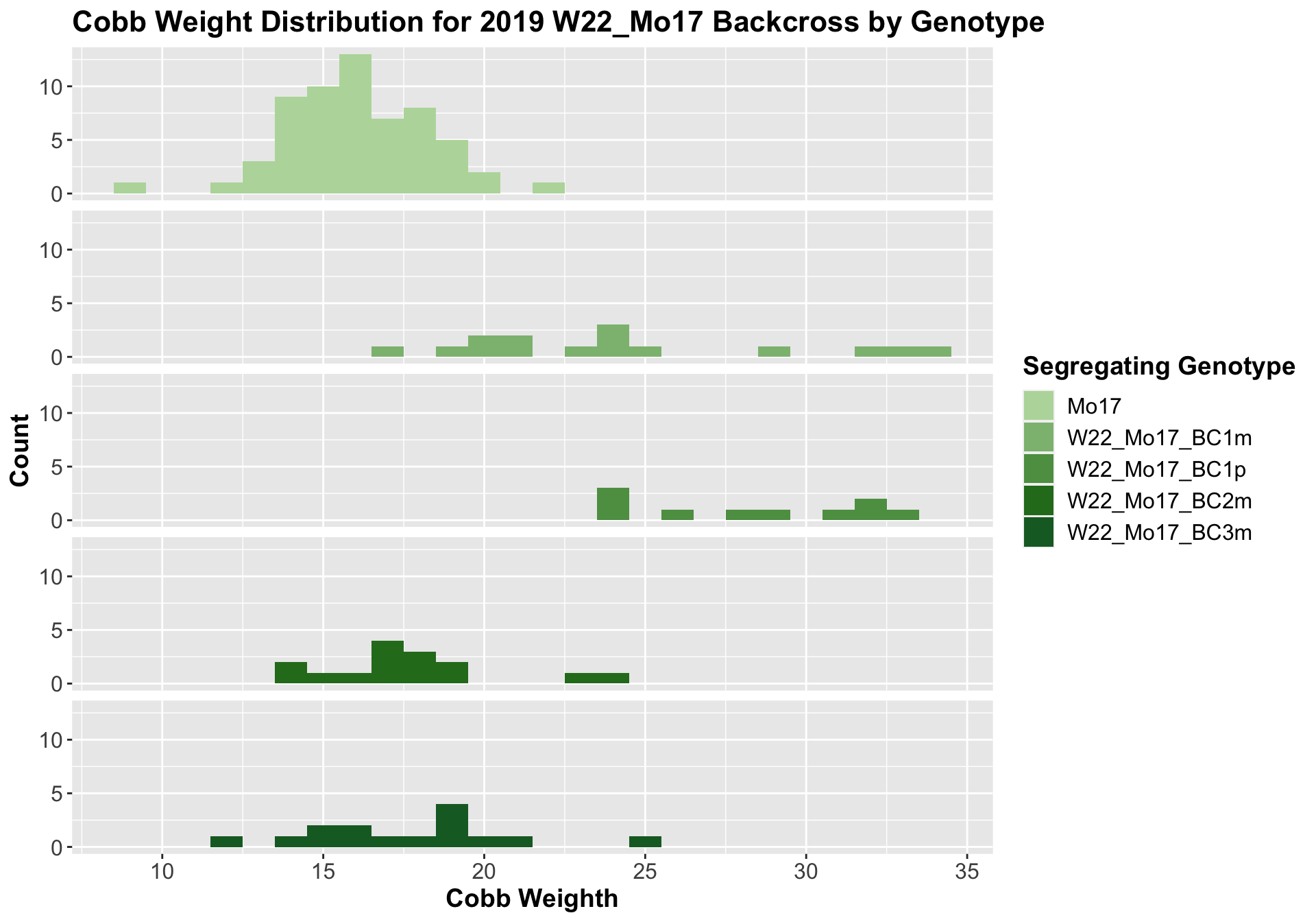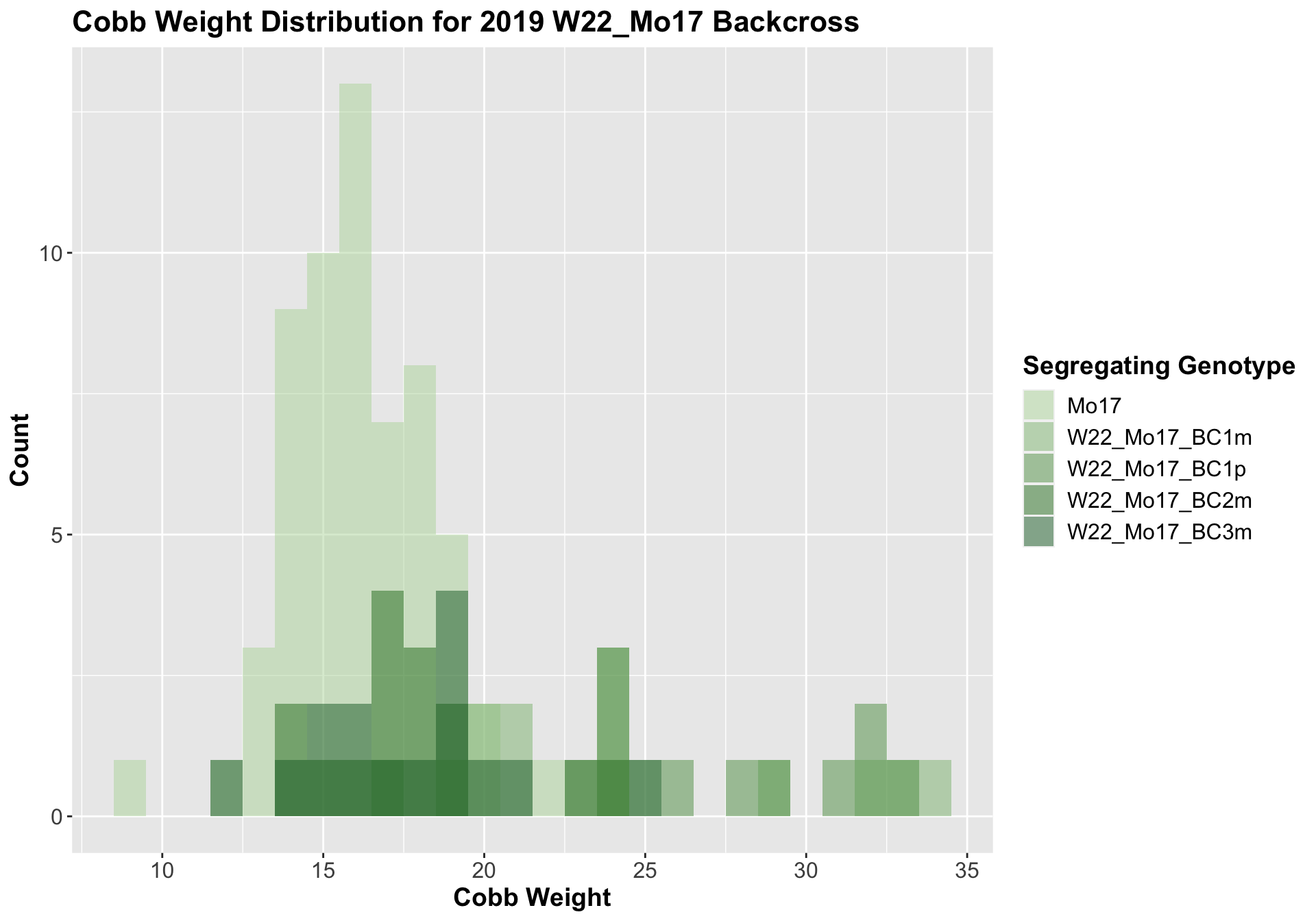 We see a significant increase in cobb weight at the sW22_Mo17 F1s that declines across subsequent backcrosses. By the later generations, it is not that different from the Mo17 cobb weight. This is similar to what we saw for the sW22_B73 backcross.