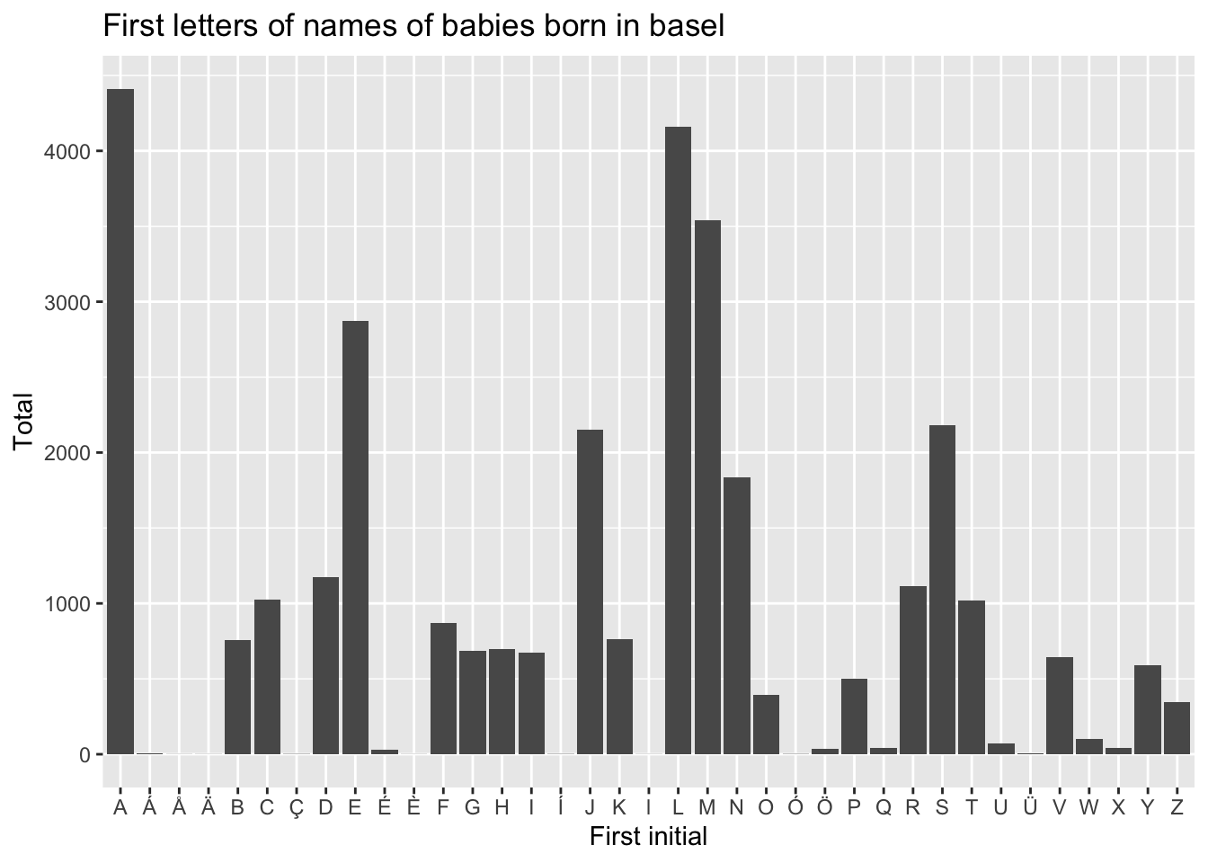 Let’s say we want to know how many Basel babies have names for each letter of the alphabet.