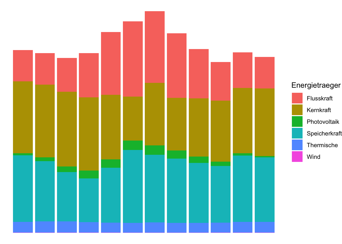 ggplot(aes(x = Datum, y = Produktion_GWh, fill = Energietraeger)) +