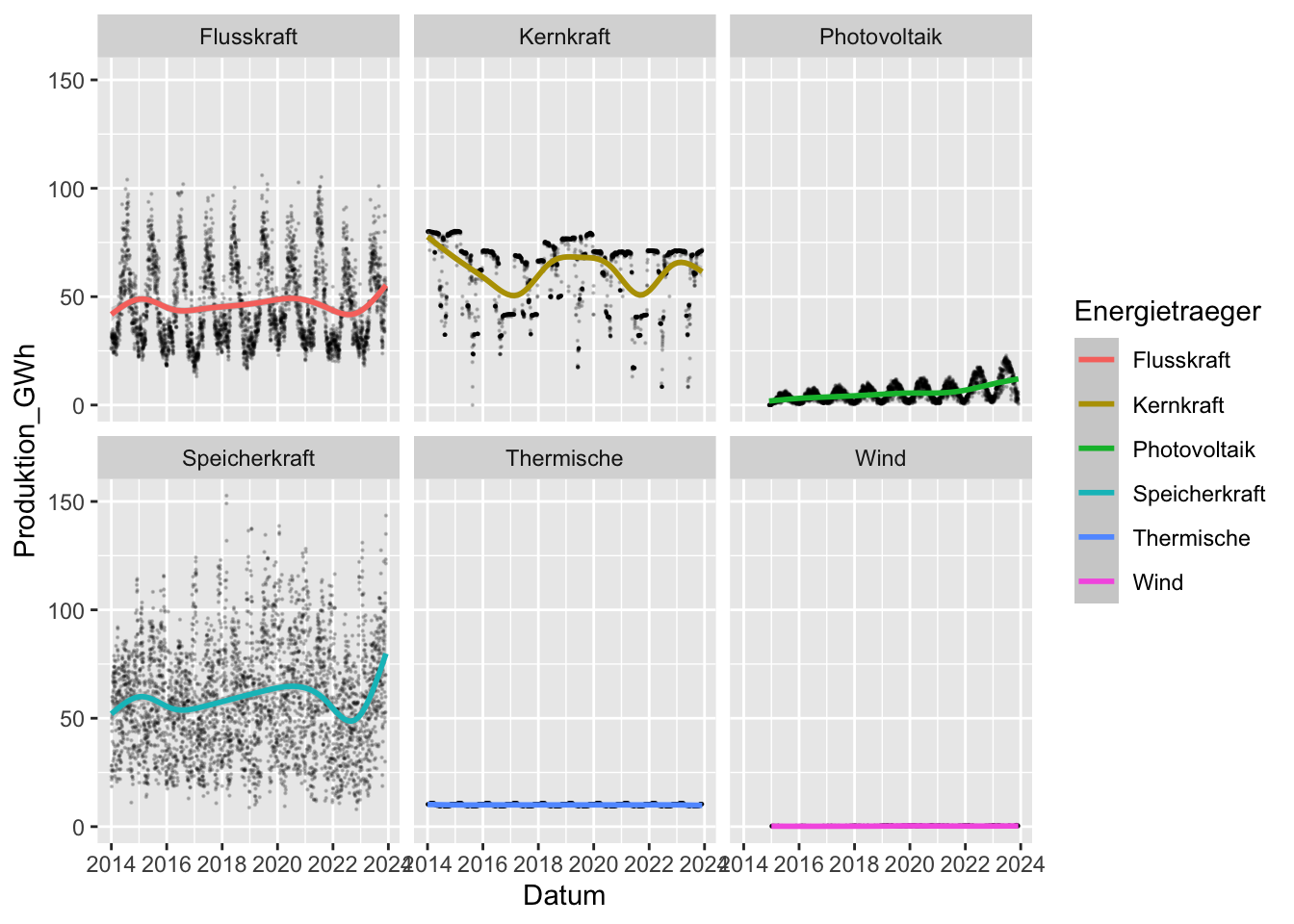 geom_smooth(aes(x = Datum, y = Produktion_GWh, color = Energietraeger))## `geom_smooth()` using method = 'gam' and formula = 'y ~ s(x, bs = "cs")'
