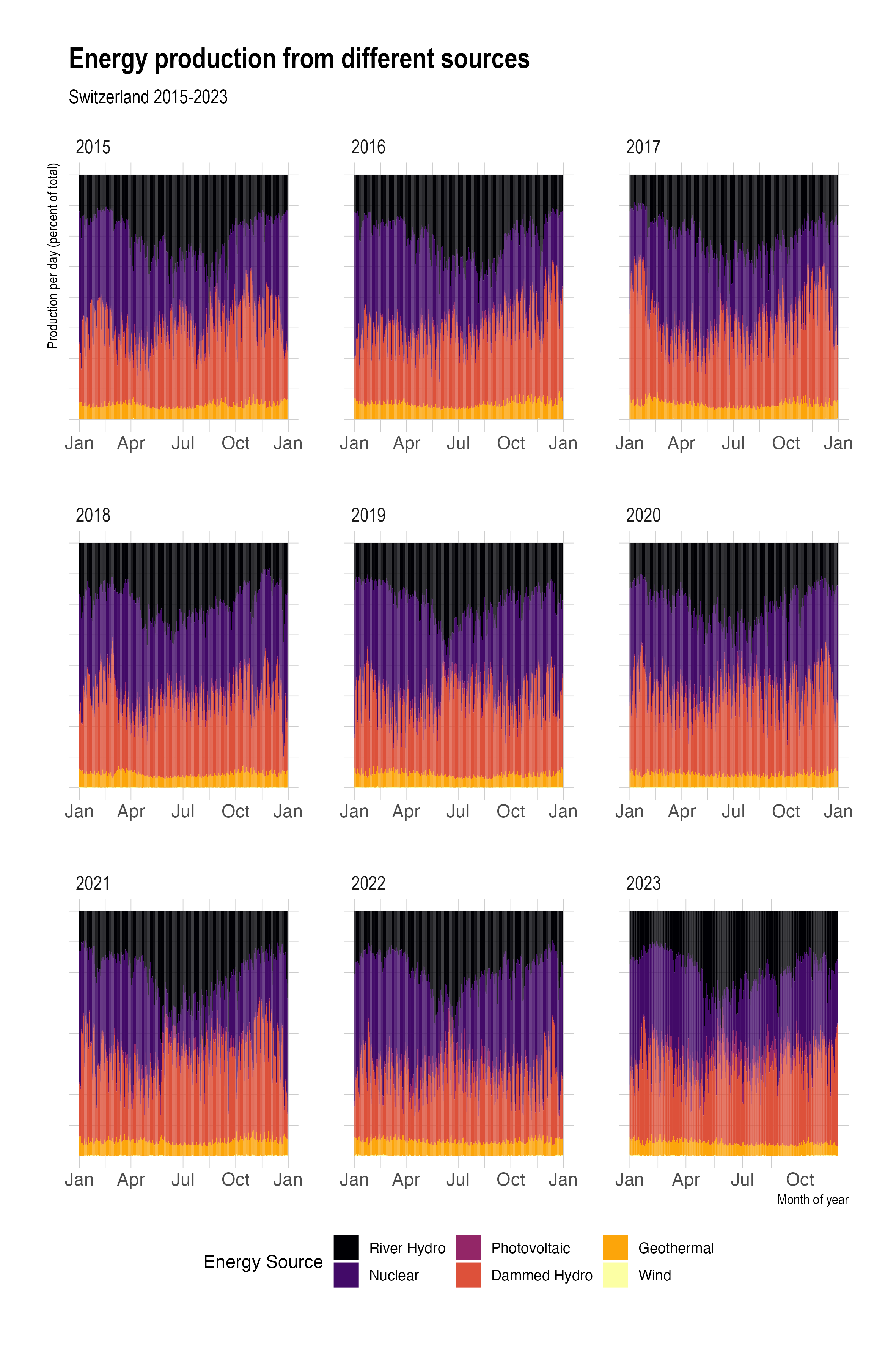 scale_fill_viridis_d(option = "B", labels = c("River Hydro", "Nuclear", "Photovoltaic", "Dammed Hydro", "Geothermal", "Wind")) +