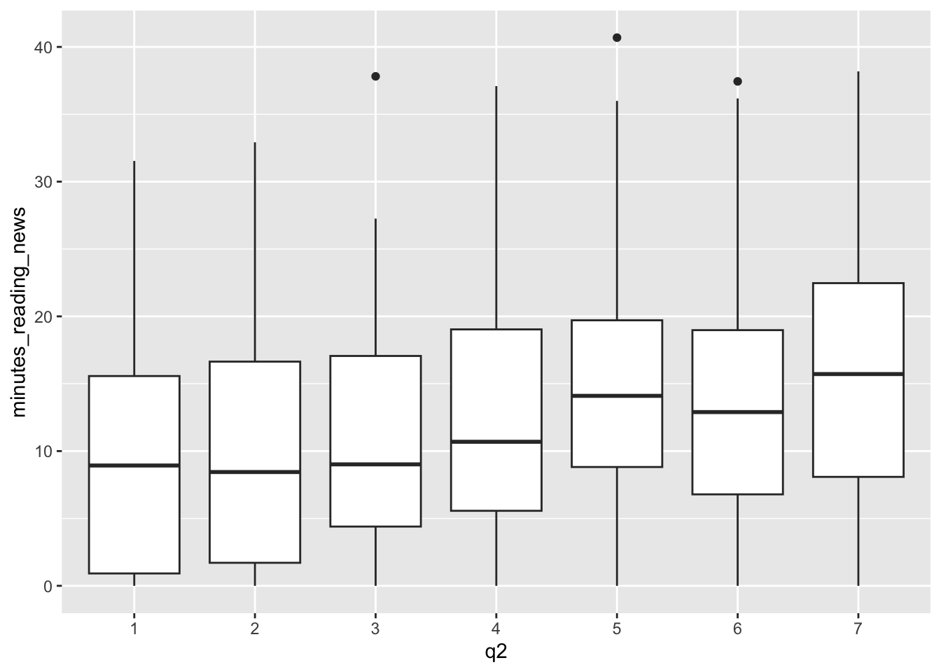 geom_smooth(aes(x = q7, y = minutes_reading_news), method = "lm")## `geom_smooth()` using formula = 'y ~ x'