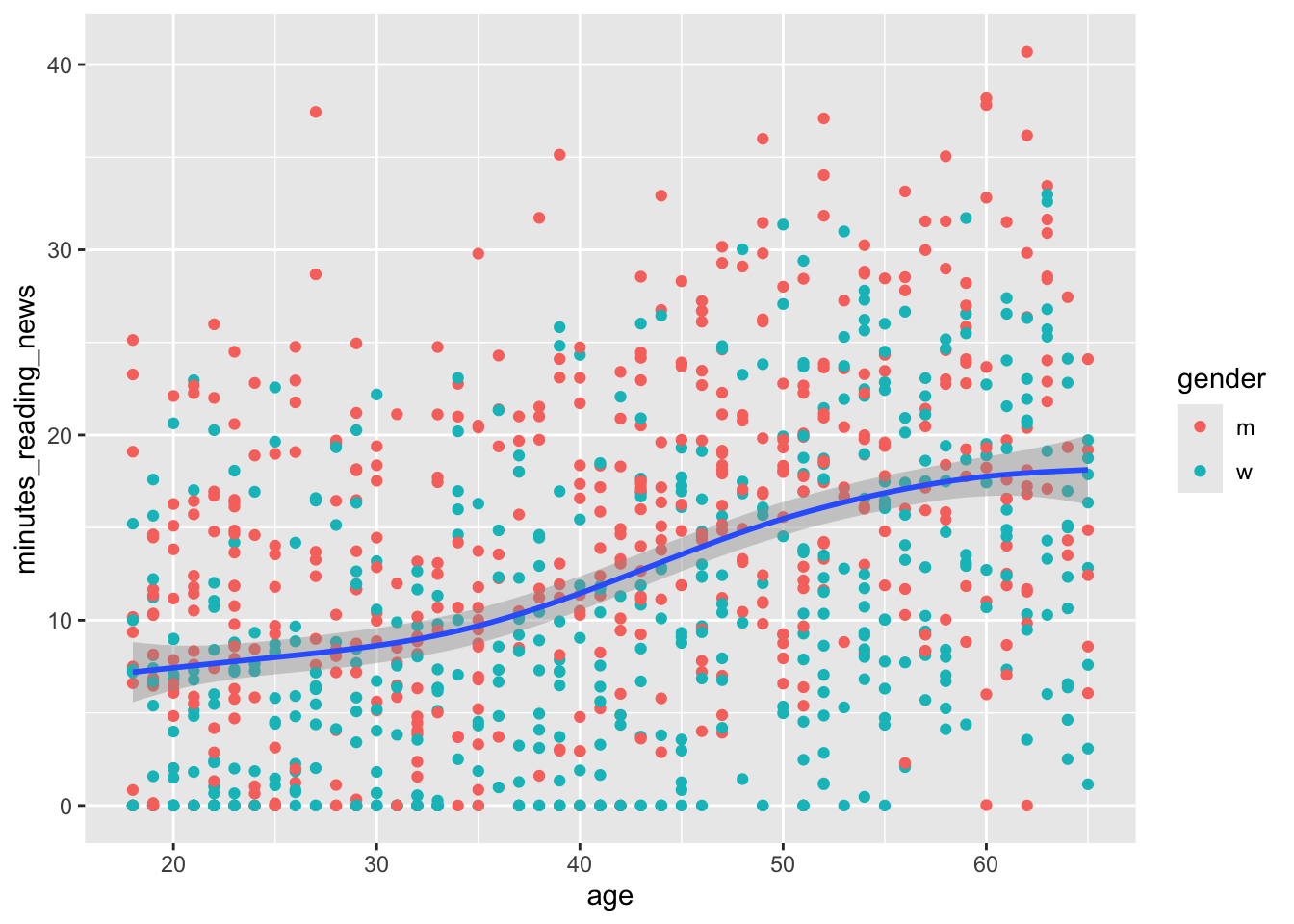 geom_smooth(aes(x = age, y = minutes_reading_news))## `geom_smooth()` using method = 'gam' and formula = 'y ~ s(x, bs = "cs")'