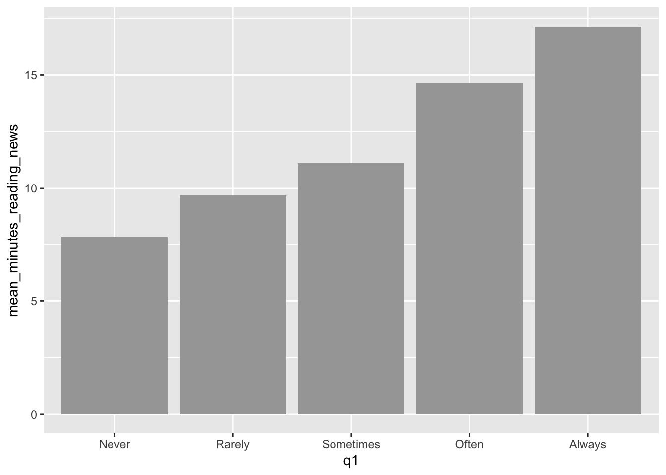 Just like when we were cleaning data, we can use the pipe operator to process data before we make a plot. This can be useful when we want to summarize data or change the order of the levels of a factor. Here, we’ll use the group_by() and summarize() functions to calculate the mean amount of time people spend reading the news for each level of question 1.