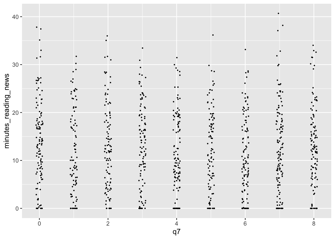geom_jitter(aes(x = q7, y = minutes_reading_news), width = 0.1, size = 0.3) +