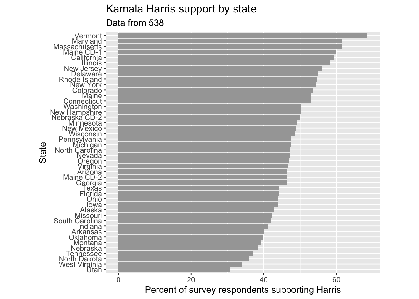 In this one, I’ve extracted just the polls for Kamala Harris, and I want you to make a bar chart showing the average percentage of supporters by state.