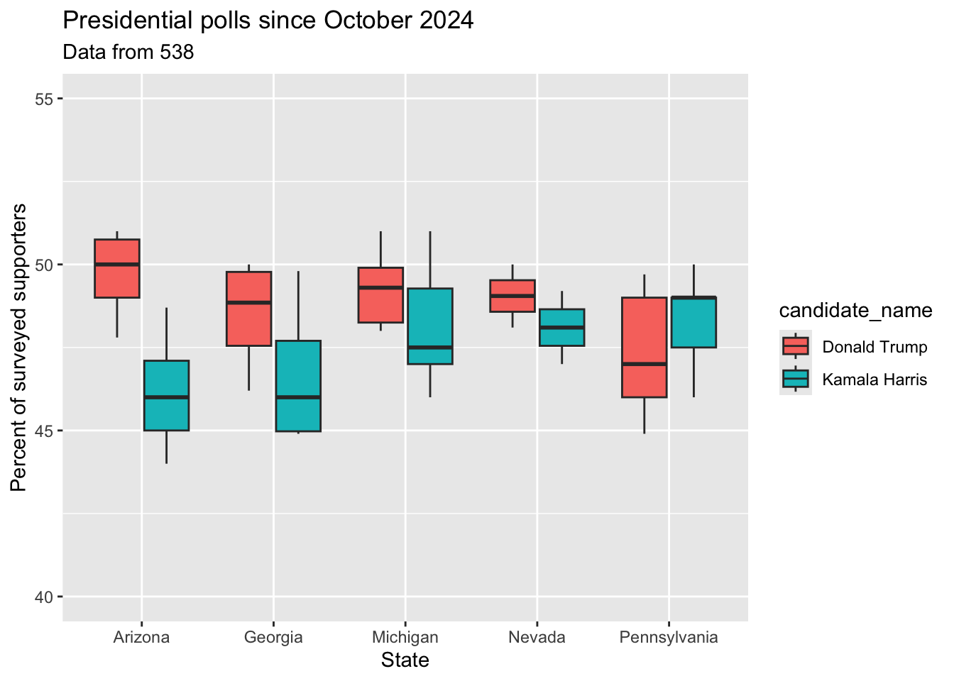 Finally, I want you to make a boxplot showing the percentage of supporters for Kamala Harris and Donald Trump in the most important swing states since October 2024.