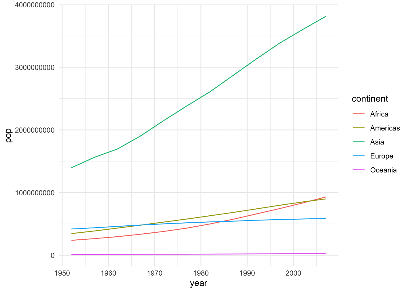 Let’s go back to the basics, and make a simple line plot of the population of each continent over time. First, we need to summarise the population of each continent by year. Because we want to add the data for each country, we’ll use sum().
