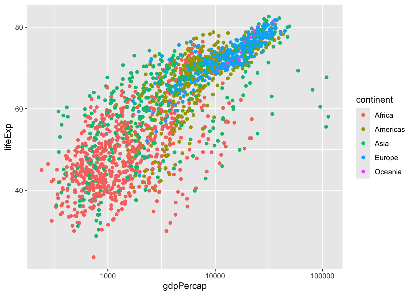 pop_vs_gdp_plot <- ggplot(gapminder, aes(gdpPercap, lifeExp, color = continent)) +