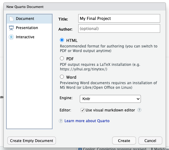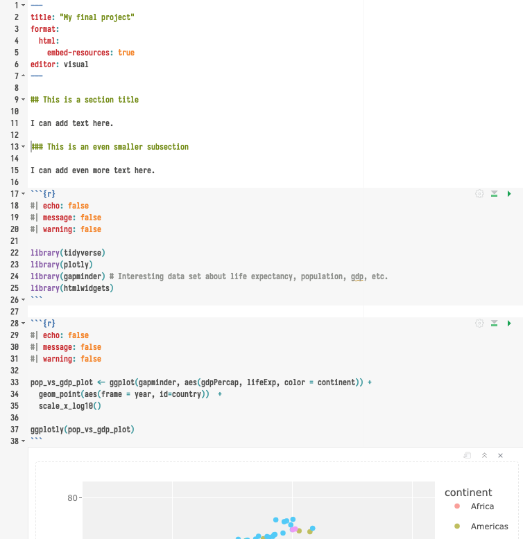 Your final project for this class will be to create a web report that uses interactive graphics. The easiest way to do this with R is to export a Quarto document.
