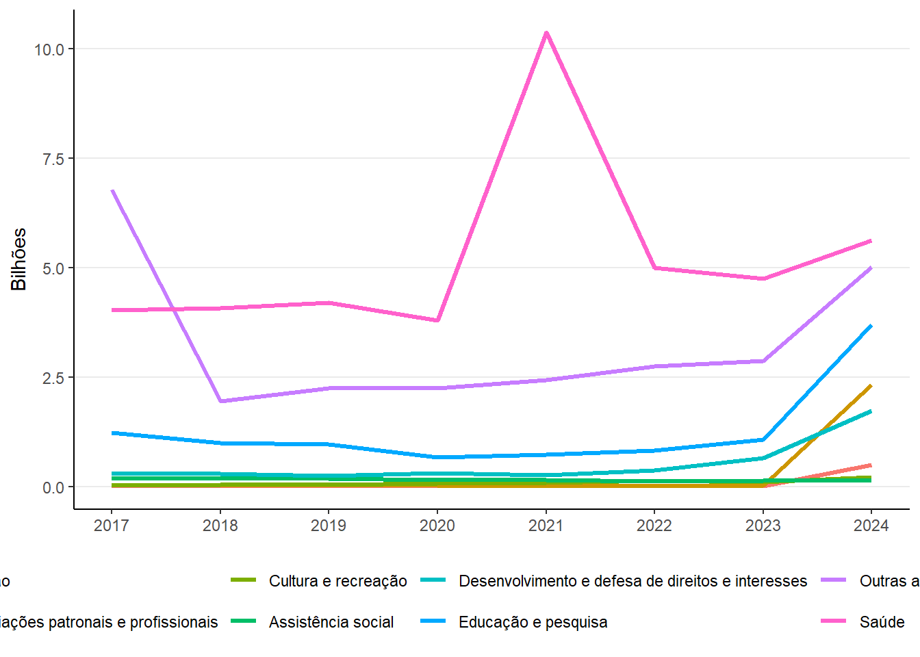 | Outras organizações da sociedade civil | 6.781,5 | 1.957,3 | 2.248,0 | 2.253,9 | 2.437,4 | 2.743,7 | 2.876,2 | 5.018,2 |